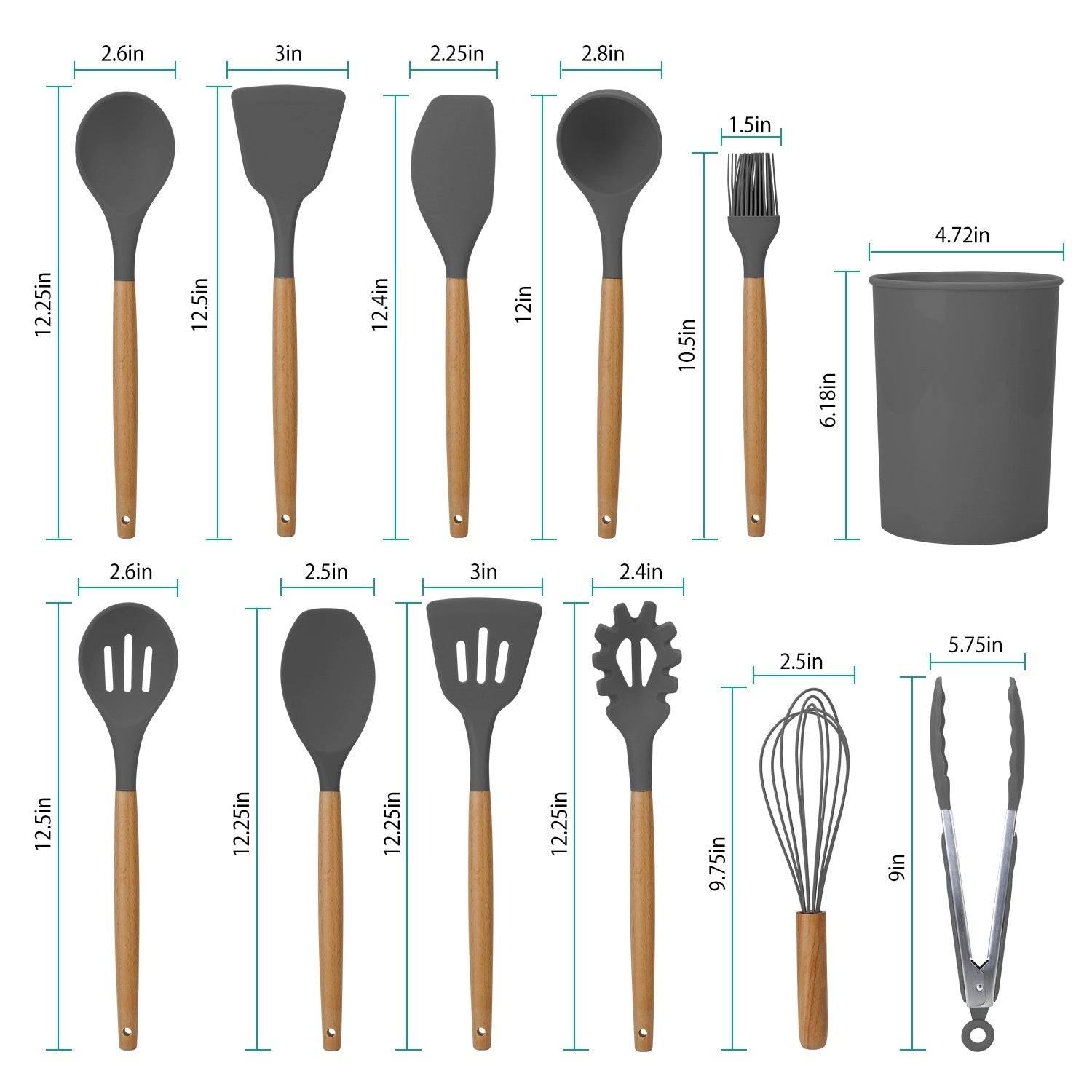 *Silicone Utensil Kitchen Set: 11Pcs utensil set includes deep silicone ladle, silicone turner, silicone slotted turner, silicone spaghetti server, silicone oil brush, silicone tongs, silicone slotted spoon, silicone spoonula, silicone spatula, egg whisk and spoon. Utensil Set includes everything you need to cook that perfect dish.