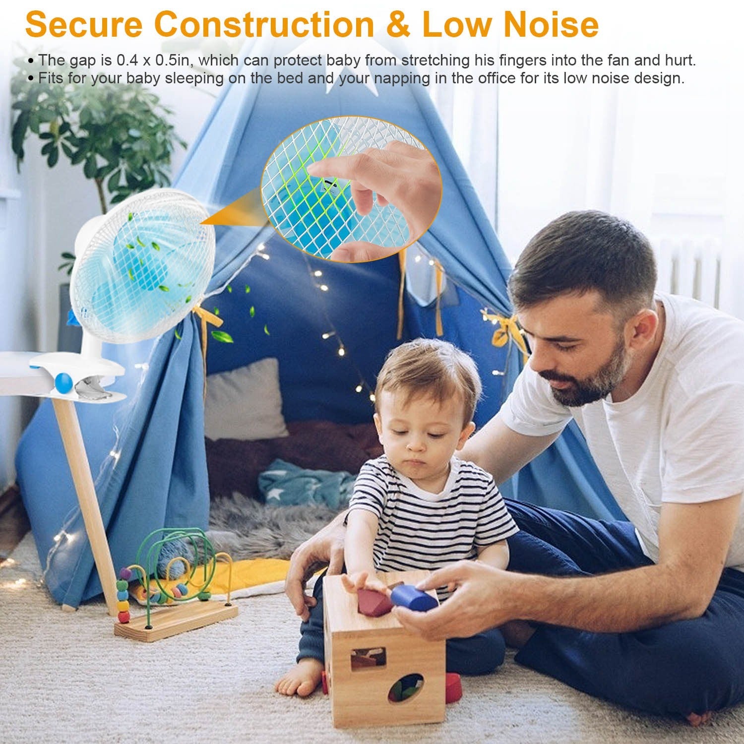 - *Secure Construction & Low Noise*: It fits for your baby sleeping on the bed for its low noise design. Besides,the gap of the fan is .4 x .5in,which can protect baby from stretching his fingers into the fan and hurt. It also fits for your napping in the office.