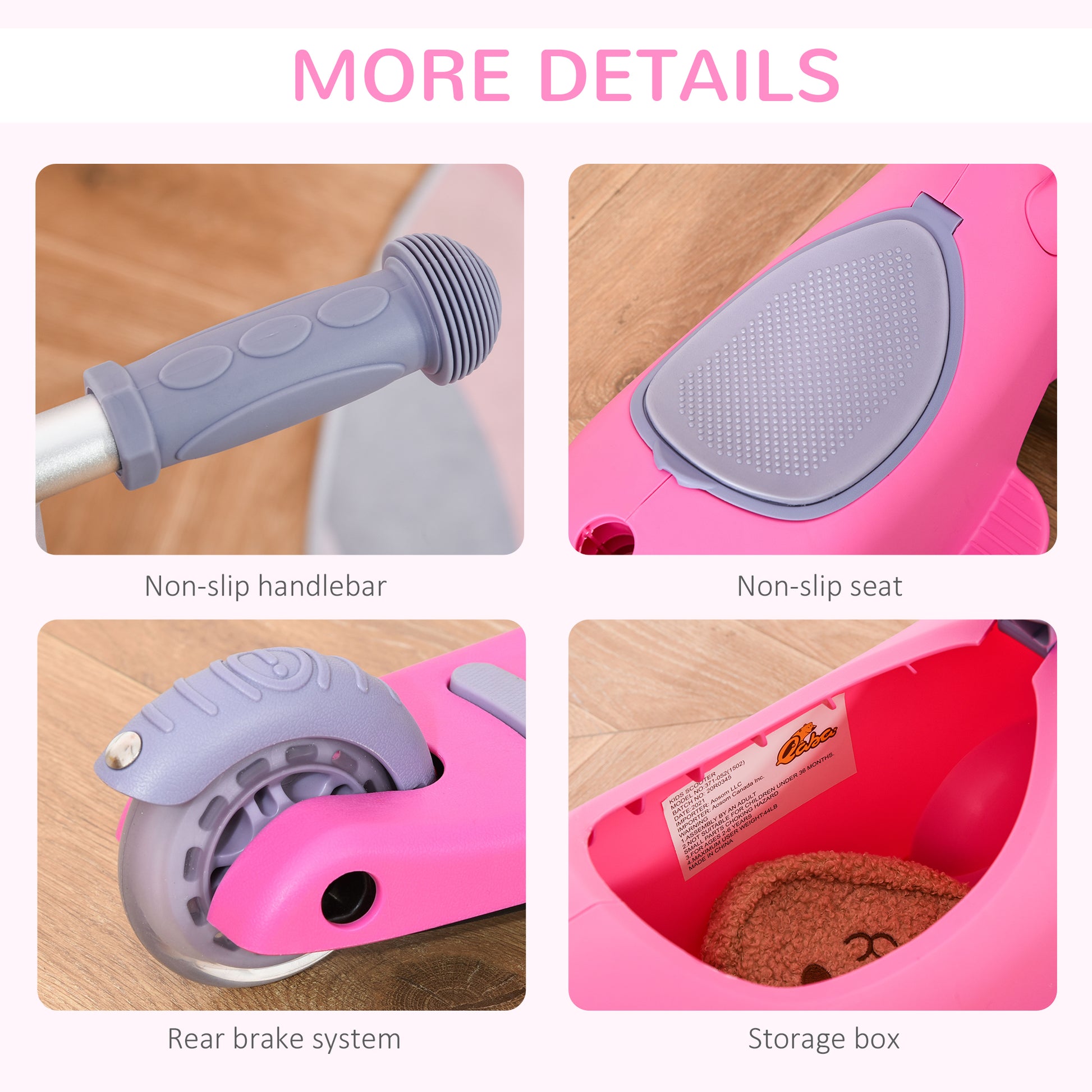 This Qaba 3-in-1 kids scooter is a fully-featured gift for kids from 2 to 6 years old. The three playing modes include: scooter, sliding car, and push walker, giving sweeties a variety of fun while encouraging them to improve balance, motor skills, and coordination. Gradually adjust the height of this scooter to match the height of kids as they grow. Made with safe and durable materials, let your sweetie enjoy riding with a kids scooter that won't immediately outgrow them. Features: - Three playing modes: kids scooter, sliding car, and push walker - Height adjustable handlebar with three levels - Non-slip handle grip and textured seat - Three wheels provide proper balance - Rear-wheel brake system - Storage box under the seat - Formed with high-quality PP and metal - Recommended ages from 2 to 6 years - Assembly required Specification: - Color: Pink - Material: PP, Metal - Overall Size: 22"L x 9.5"W x 30"H - Storage Box: 21.75"L x 10.5"W x 17.25"H - 3 Levels Hight: 29.5", 32.75", 35.75" - Front Wheel: ¦µ4.75" x 1"T - Rear Wheel: ¦µ3.25" x 1"T - Maximum weight capacity: 44 lbs - Certification: ASTM F963, CPSIA, SOR - Item Label: 371-025PK Package Includes: - 1 x Kids scooter - 1 x Instruction manual.