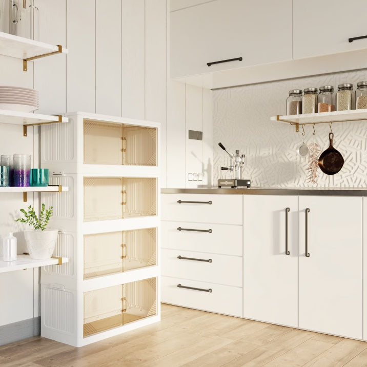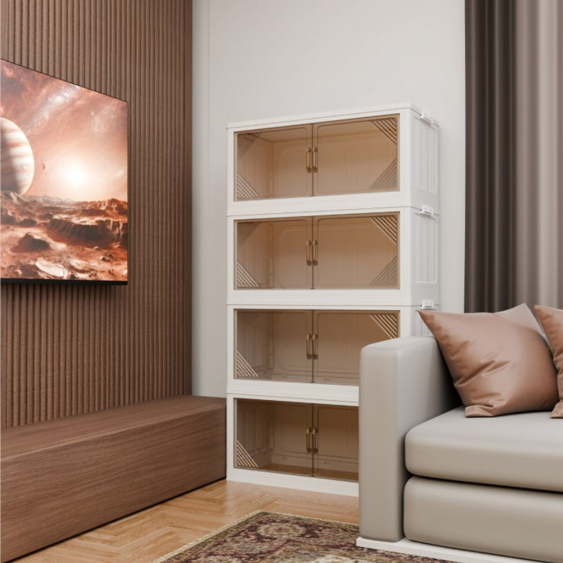 Product name: 573QT 4-Pack 35.4\' Wide Transparent Plastic Storage Cabinets for Closet Organizers and Storage, Folding Storage Box, Stackable Storage Bins with Open Front Door