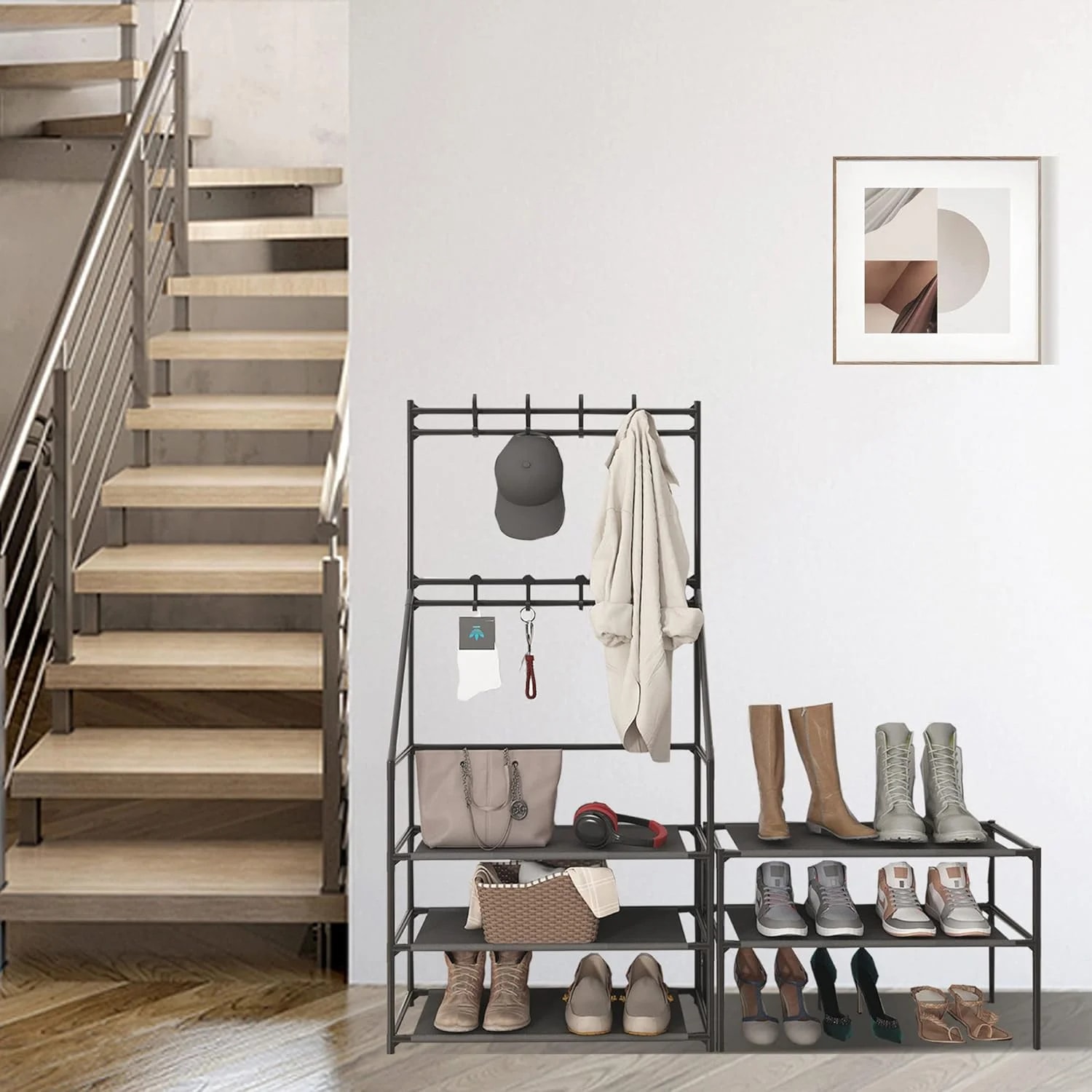 3-In-1 Entryway Coat Rack With Shoe Rack, Coat Clothes Rack Shoe Storage Bench, Multipurpose Hat And Shoe Storage Rack With 5-Tier 8 Hooks, Suitable For Hat, Clothes, Shoes, Key. It Is Prepared With A 5-Tier Shoe Rack And 8 Hooks, Very Thoughtfully Designed To Accommodate Different Types Of Shoes. It Is A Practical Choice For Entryways, Halls, Foyers, Utility Rooms And Bedrooms. ??Shoe Rack For Entryway/ Coat Rack / Shoe Rack / Shoe Organizer/ Coat And Shoe Rack/ Shoe Rack With Coat Hanger/Shoe Rack Entryway/Entryway Rack/Narrow Shoe Rack/Stackable Shoe Rack. Perfect Combination For Shoe Racks, Coat Racks And Other Small Item Storage. There Is No Need To Mount It On The Wall And It Will Not Damage The Wall. This Shoe Rack Is Freestanding And Removable. Rack Is Freestanding And Removable. Feel Free To Place And Move It As Needed. Narrow Shoe Cabinet Suitable For A Wide Range Of Spaces, Whether It's An Entryway, Hall, Foyer Or A Bedroom. Entryway, Hall, Foyer, Hallway, Bedroom Or Bathroom, Etc.5-Tier Shoe Rack Is Designed To Provide More Storage Space For Storing Shoes.?