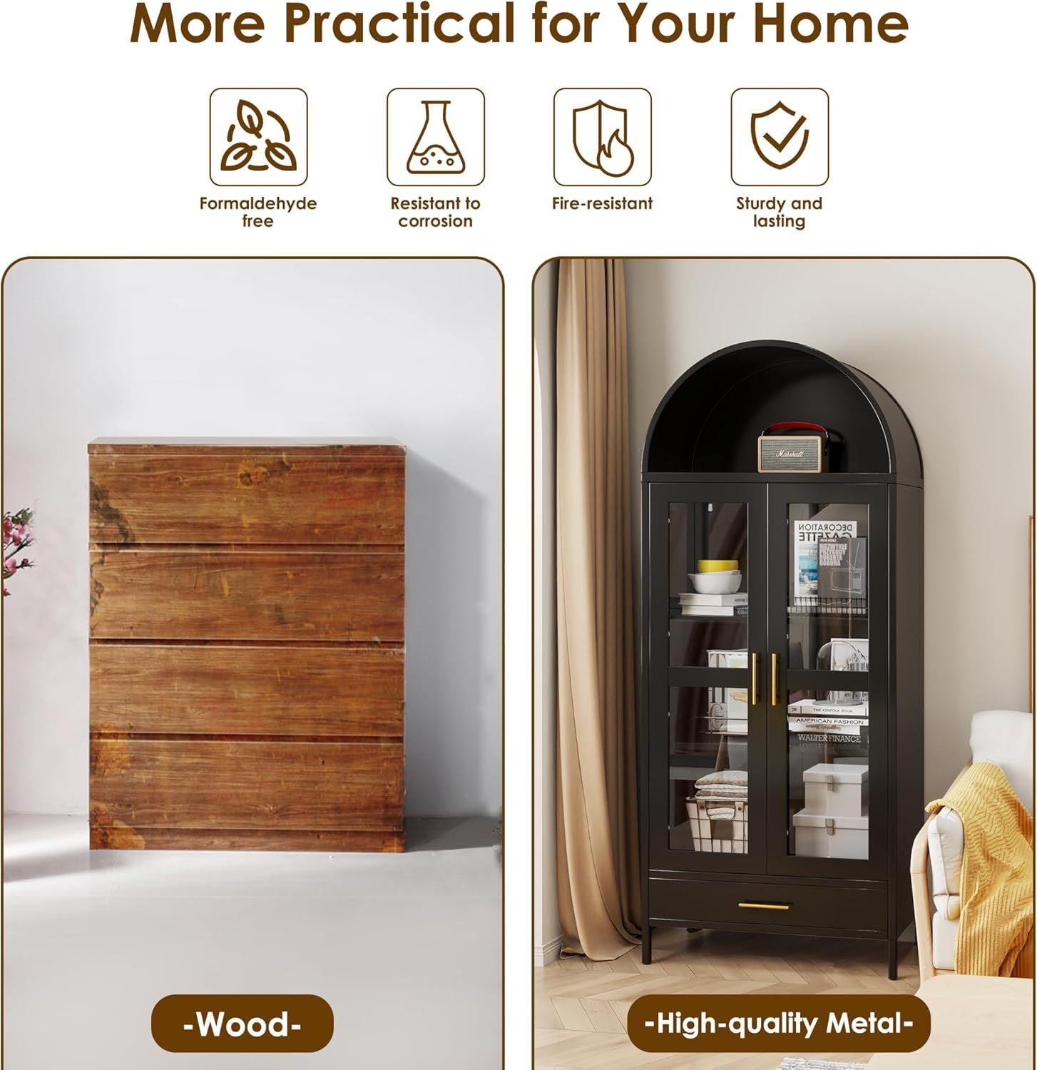 US Local 73In Tall Metal Arched Cabinet, Arched Display Pantry Cabinet With Glass Door, Modern Farmhouse Bookcase With 1 Drawer And 2 Adjustable Shelves For Living Room, Black, Assembly Required