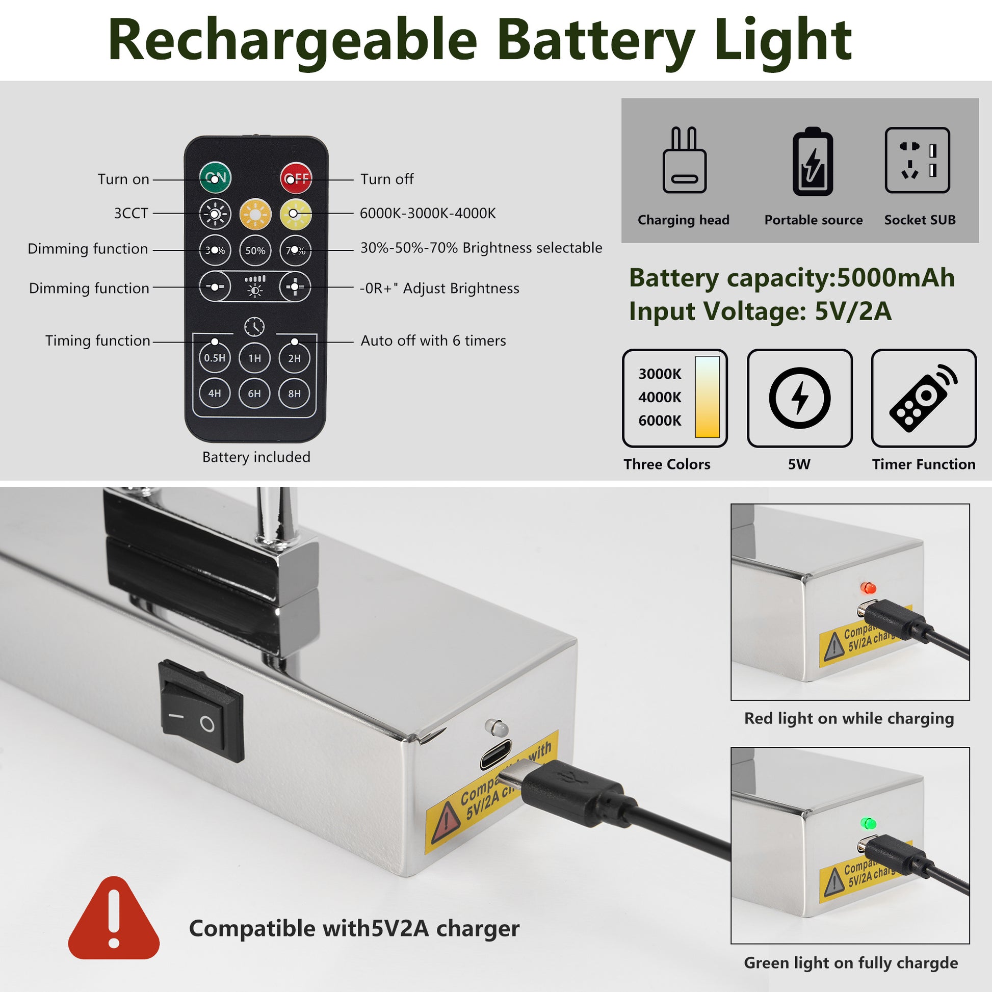 ¡¾RECHARGEABLE & TIMER FUNCTION¡¿: Chrome wall sconces battery operated with built-in 5000mAh rechargeable batteries, library light battery operated also has a timer function, you can set the fixed working time of rechargeable wall sconce ¡¾ADJUSTABLE WIRELESS WALL SCONCE ¡¿£ºThe battery operated art light is with swing arm allowing you to adjust the scones light distance from the wall at will as a good choice of picture lights for wall battery operated ¡¾EASY INSTALLATION¡¿: The battery operated wall light comes with a metal mounting bracket , you can fix bracket with screws or stickers, easy to take the wall mounted light down while charging