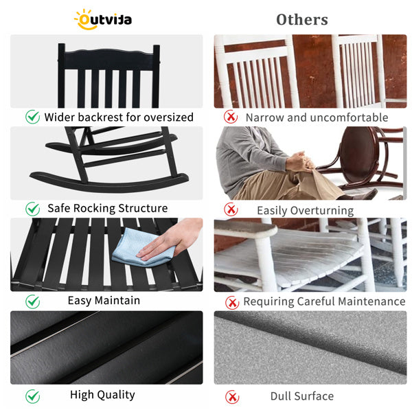 This beautifully designed Rocking Chair complements any outdoor setting, perfect for a backyard or front porch area. This rocking chair's solid wood frame and legs create a stable structure. Relax and enjoy a soothing cup of morning coffee on our rocking chair. The simple and classic design provides a comfortable rocking motion setting. Enjoy the fresh breeze of a sunny spring day or a summer night while sitting and having a conversation with friends. So don't hesitate, it's a good choice for you!