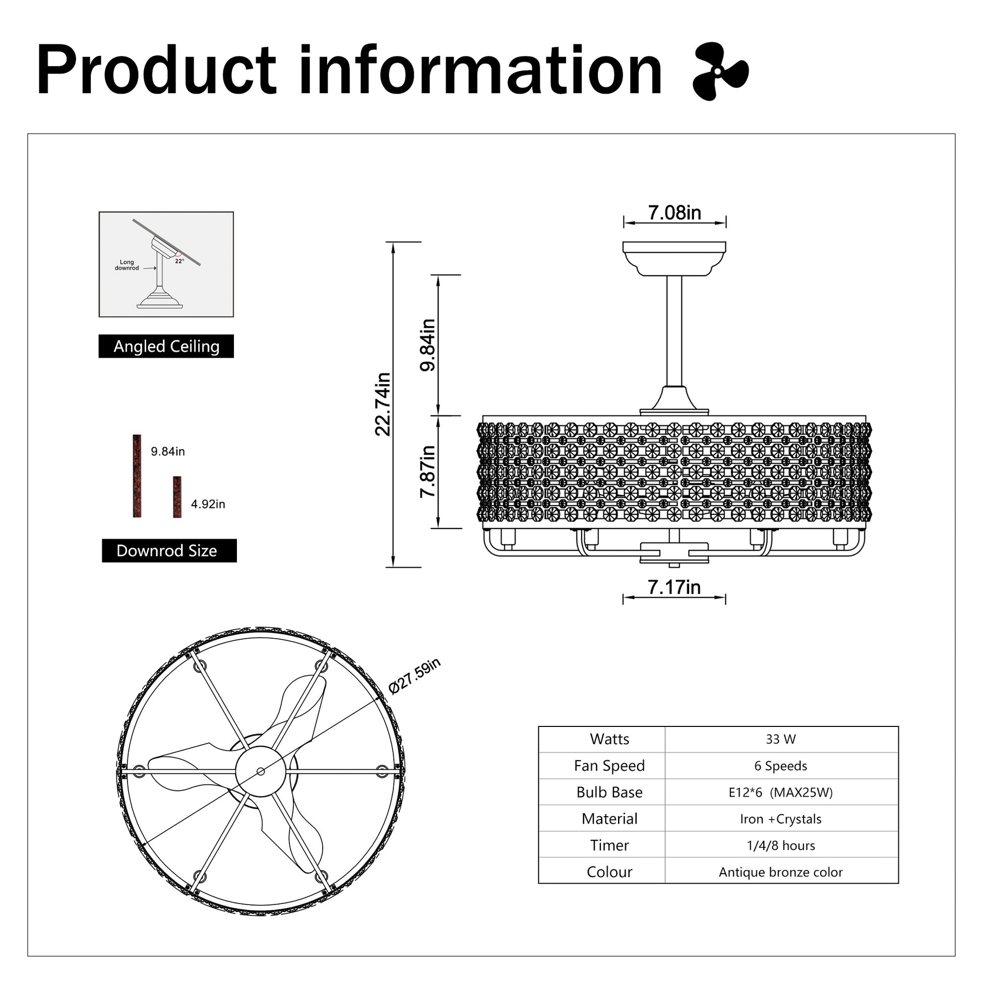 - ¡¾Superior material& design¡¿:This 26.8"crystal ceiling fan with candles contains a metal cage,2 down rods and complimentary 4*E12(NO include bulbs), sleek metal frame with elegant suitable for farmhouse, rural, industrial, postmodern, retro-style decoration.