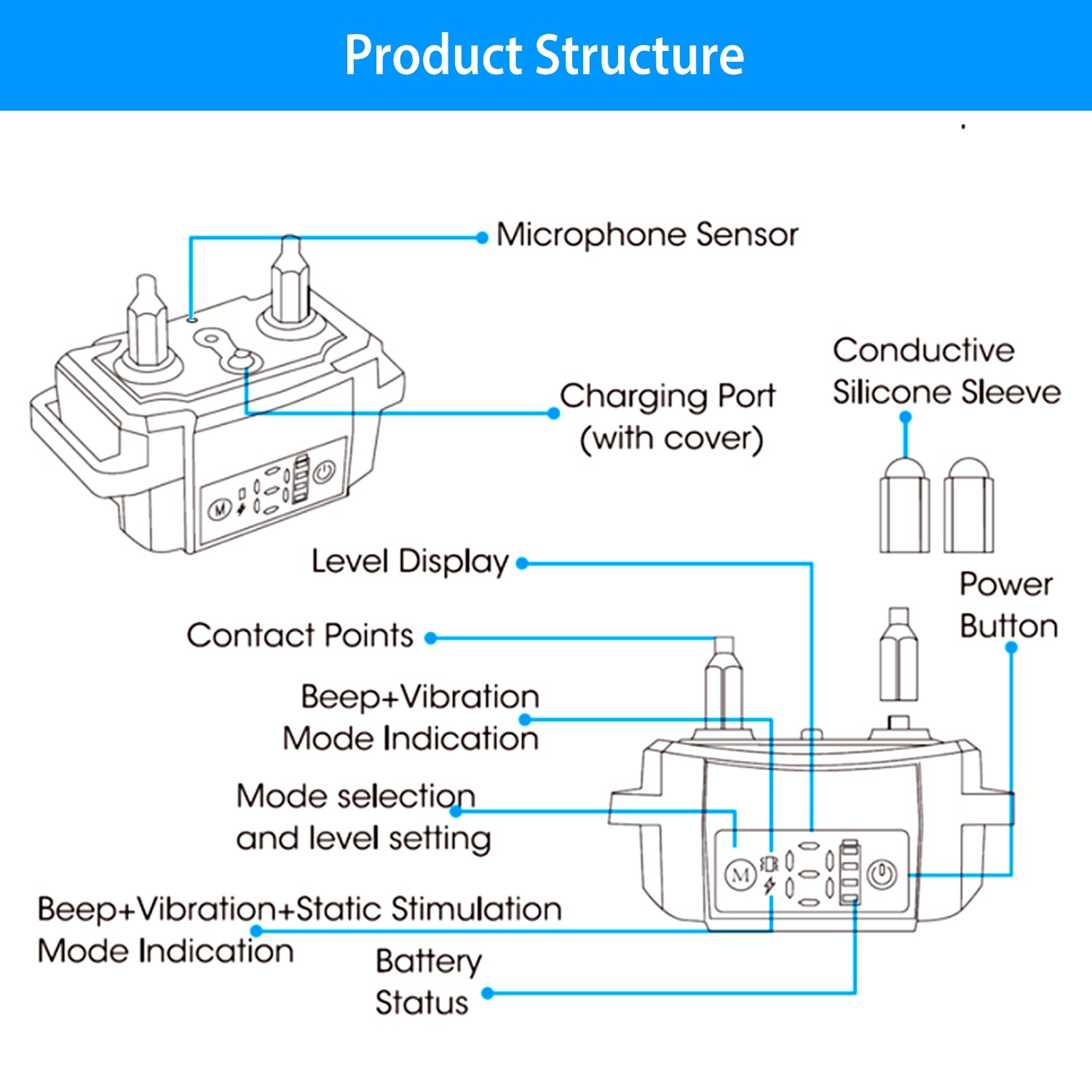 5.This bark stopper has two different anti bark mode:cyclic and fixed. A:Defaults mode is cycle mode. Under cyclic mode,first triggering is level 1 warning,if the dog continues to bark,then to level 2 warning,until the level 6 warning. B:Fixed mode(The LCD display will show the current corresponding level):You can adjust the level by pressing and holding the M button. The level changes from 1 to 6.And please release the button when you got the levels you want.