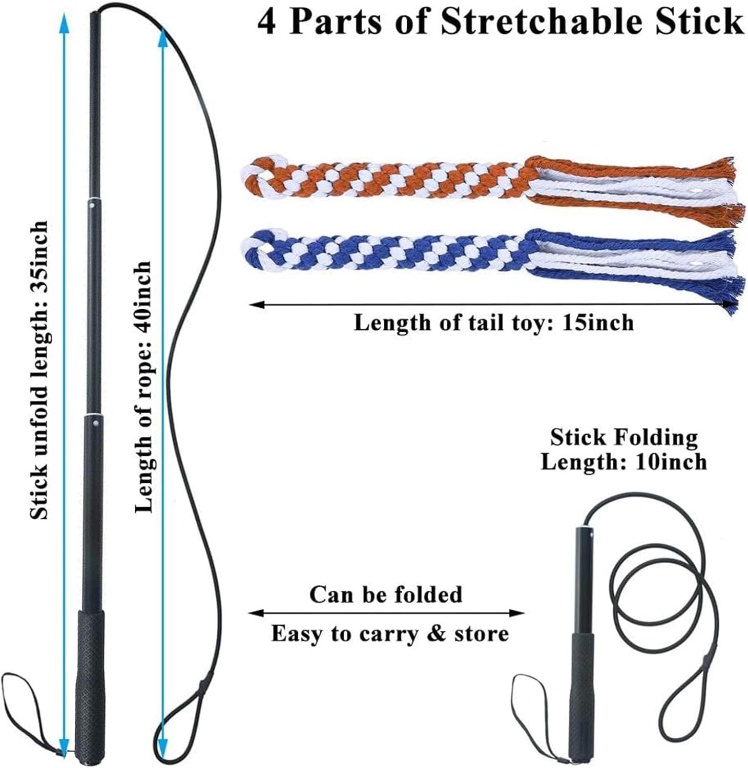 The stretchable pole and nylon cord which is lightweight and easy to store. You can get the pole compact and store it at home or your bag or other places. Providing two tough enough replaceable tail, it can help dogs keep fit when dogs jump around with pole, chase, run, and play.