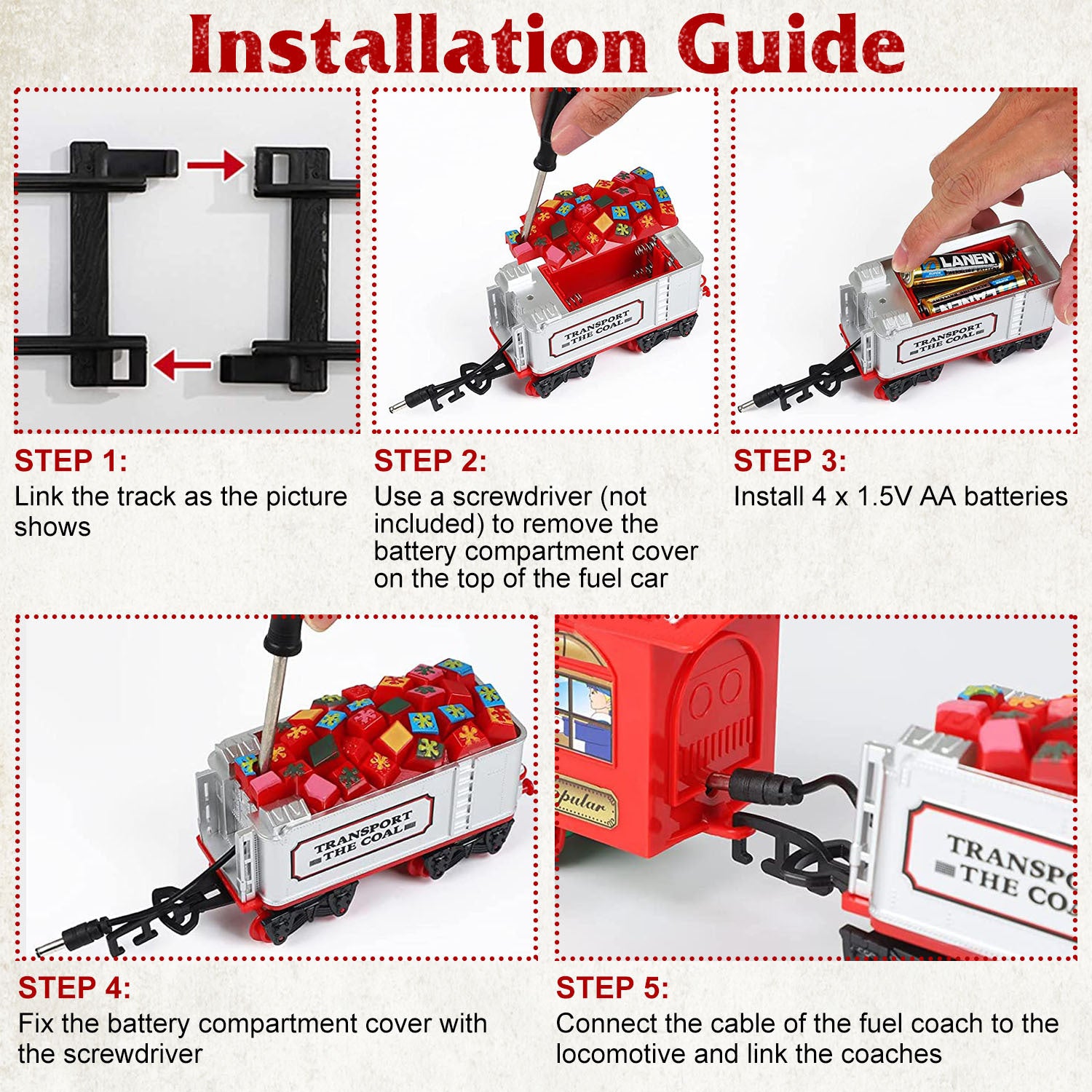 - *Realistic Music And Light*: When running around on the track,this Christmas train features realistic sounds of authentic engine sounds and locomotive?¡¥s horns,and a headlight that lights up. The realistic sounds and light can easily bring kids back to the age of steam,where there was no internet,no TV,no smartphones,and no air travel. Only trains undertook exchange of goods and industrial material.