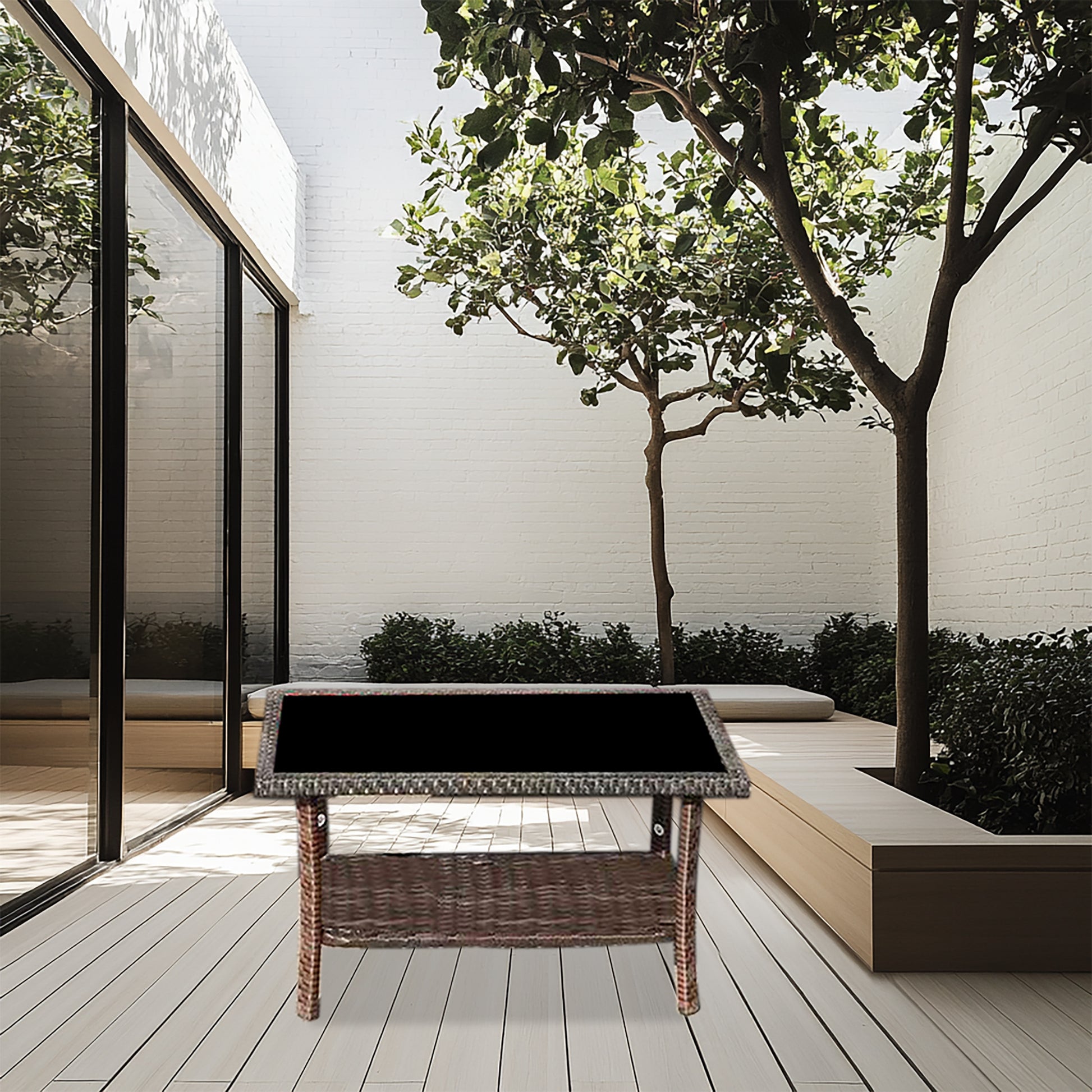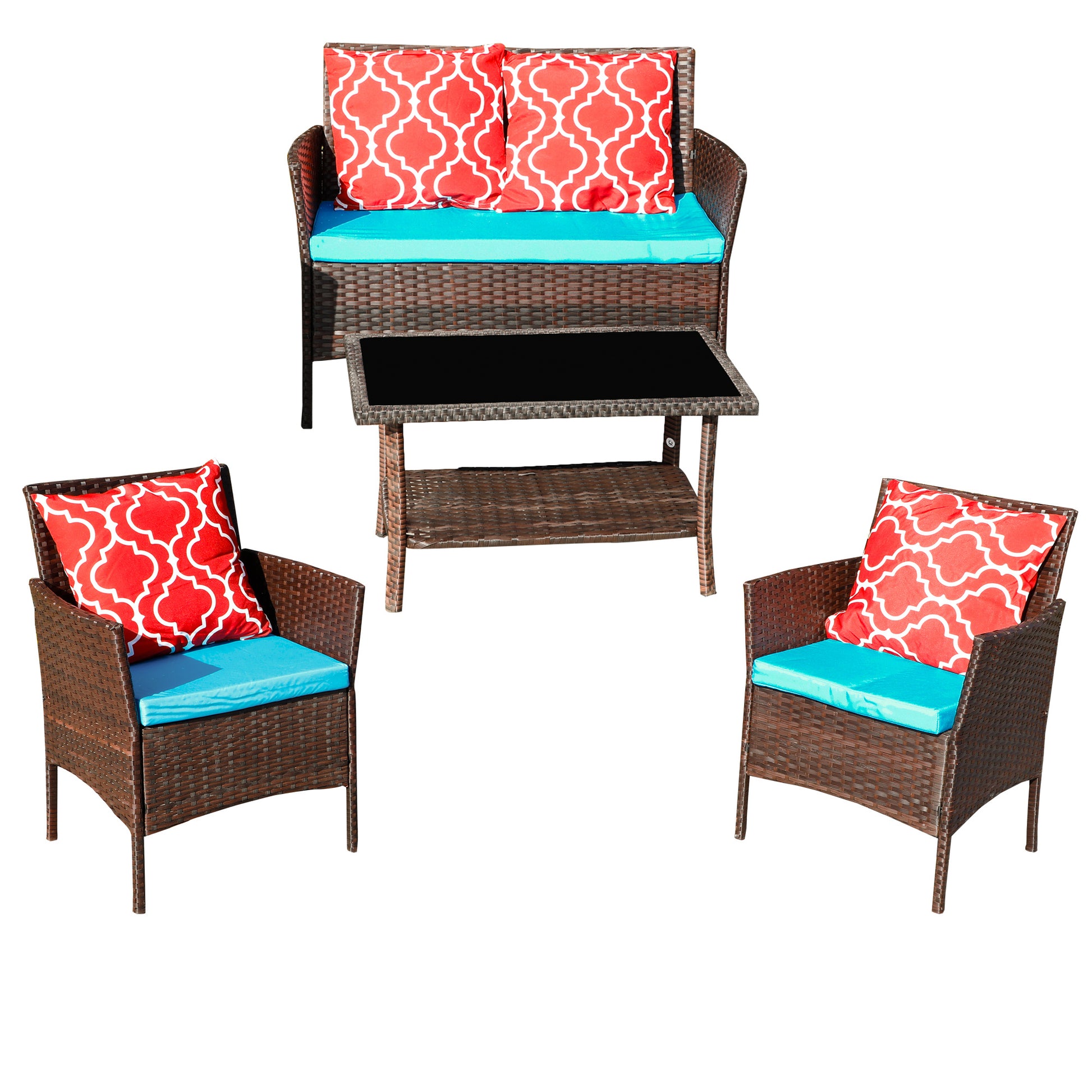- Patio Furniture 4 Pieces Conversation Sets Outdoor Wicker Rattan Chairs Garden Backyard Balcony Porch Poolside loveseat with Soft Cushion and Glass Table