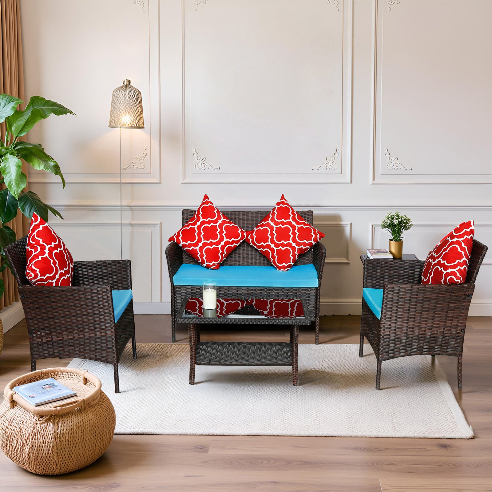 - PE flat rattan 9X1, 1MM, galvanized iron pipe 15*15*0.6 pipe, 170g polyester cloth, 5cm seat cushion, 1200g upright cotton, black silk screen tempered glass, four red and white checkered pillows ! Four-Piece Sofa Set Table With Sofa Chair PE Rattan Outdoor Furniture With Sapphire Blue Color Cushion
