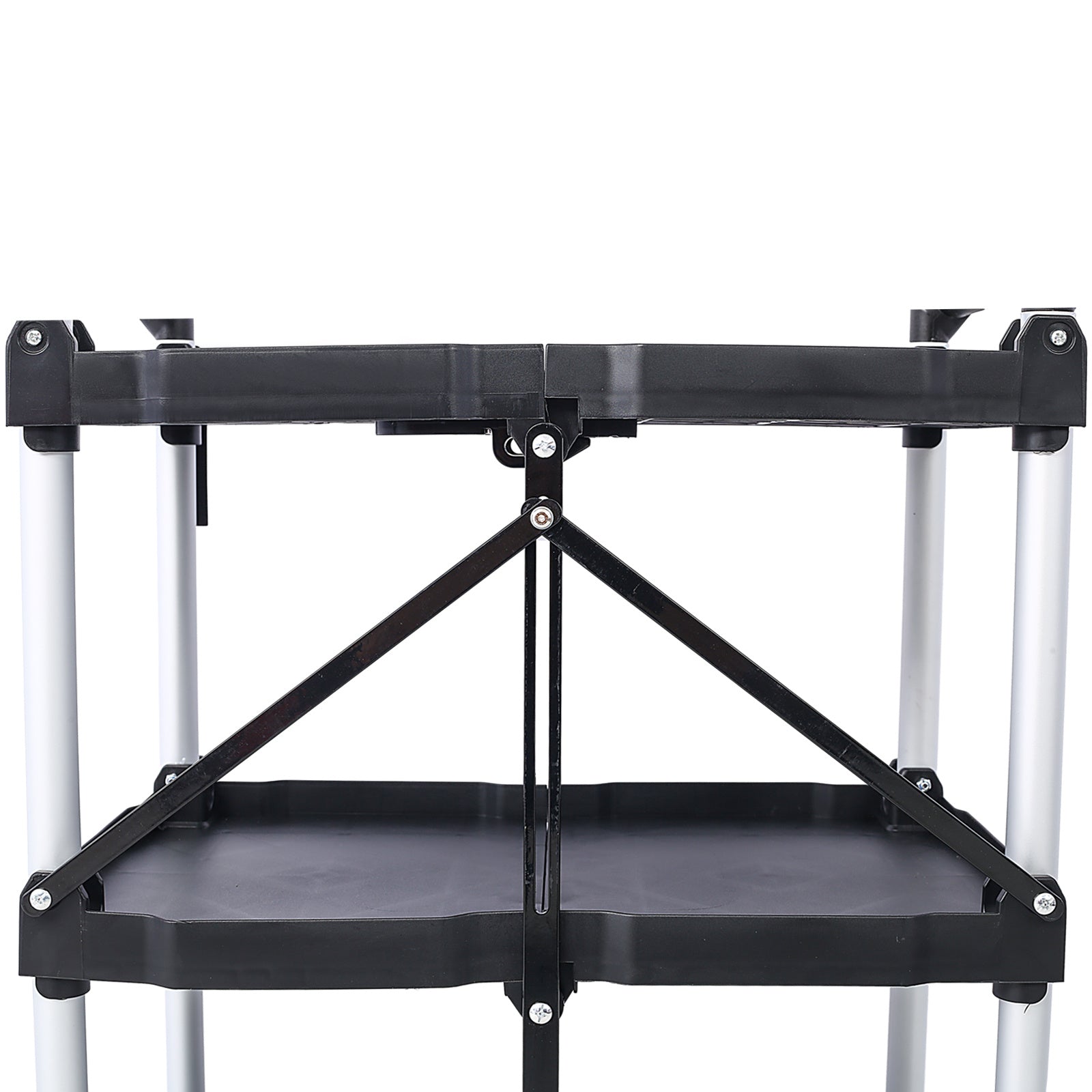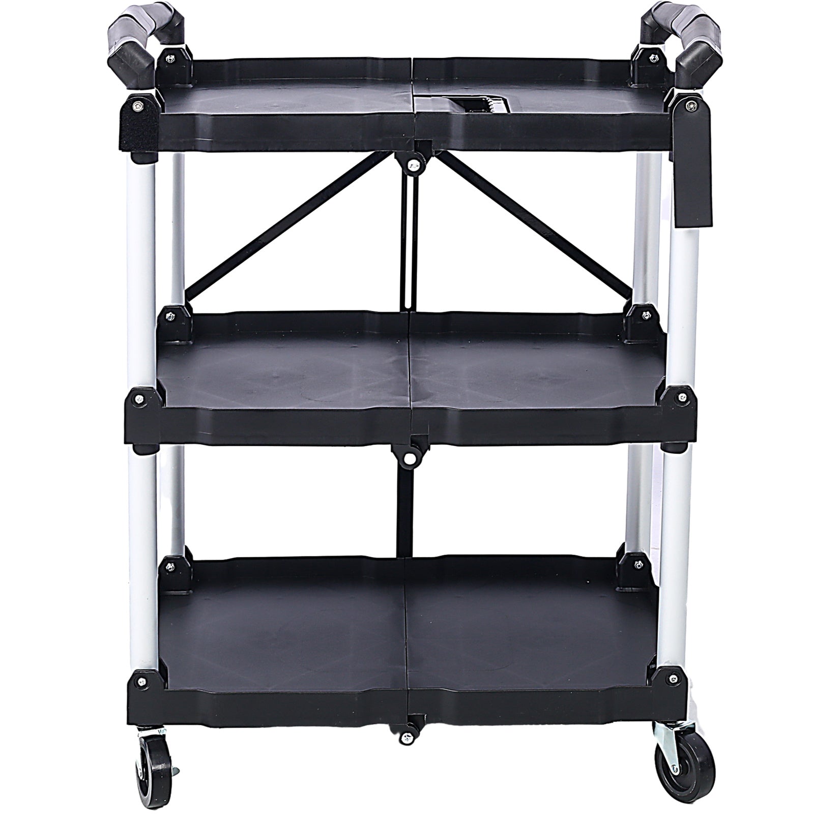 Product Name:3 Layers Folding Collapsible Service Cart Pack-N-Roll Folding Collapsible Service Cart, Black, 50 Lb. Load Capacity per Shelf