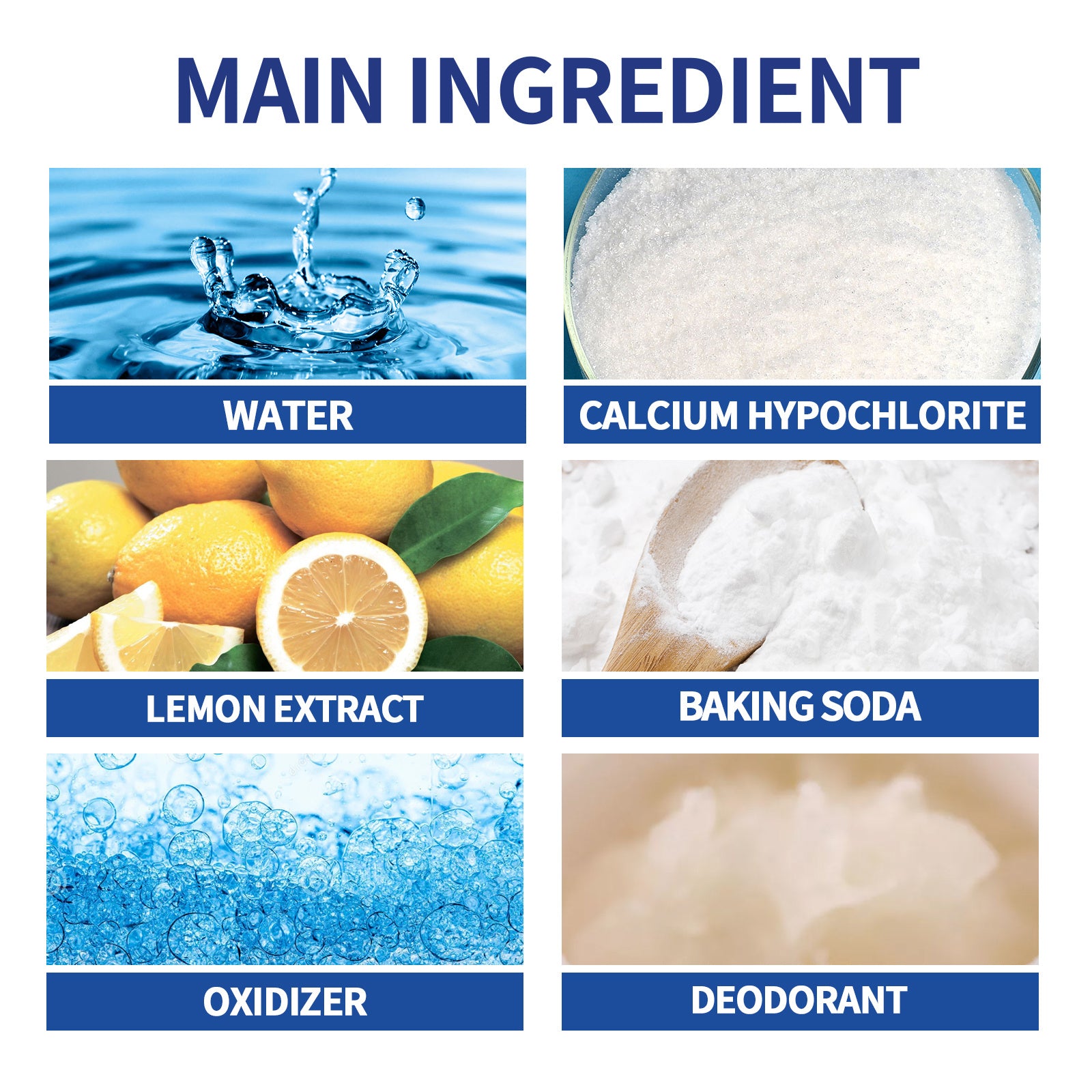 Our mold remover contains calcium hypochlorite, lemon extract, baking soda.It removes stains strongly, cleans well, saves time and energy, is harmless to items, and can be used in multiple scenarios.It is easy to use: first clean the debris on the surface, press the sprayer, spray on the surface of the mold, wait for 10-15 minutes to let the mold dissolve, and finally use a dry cloth or sponge to wipe away the dirt.After use, it can efficiently eliminate stains and sterilize, eliminate odors, and restore the use of the scene or object as new.