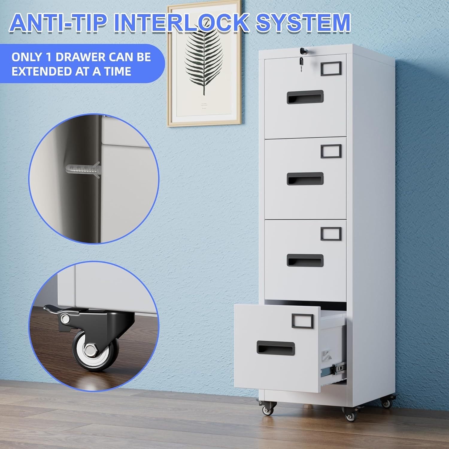 - [Safe Design] This 4 drawer file cabinet with lock metal when 1 drawer of this metal file cabinet has been opened, the interlocking system will avoid the other drawers from opening.