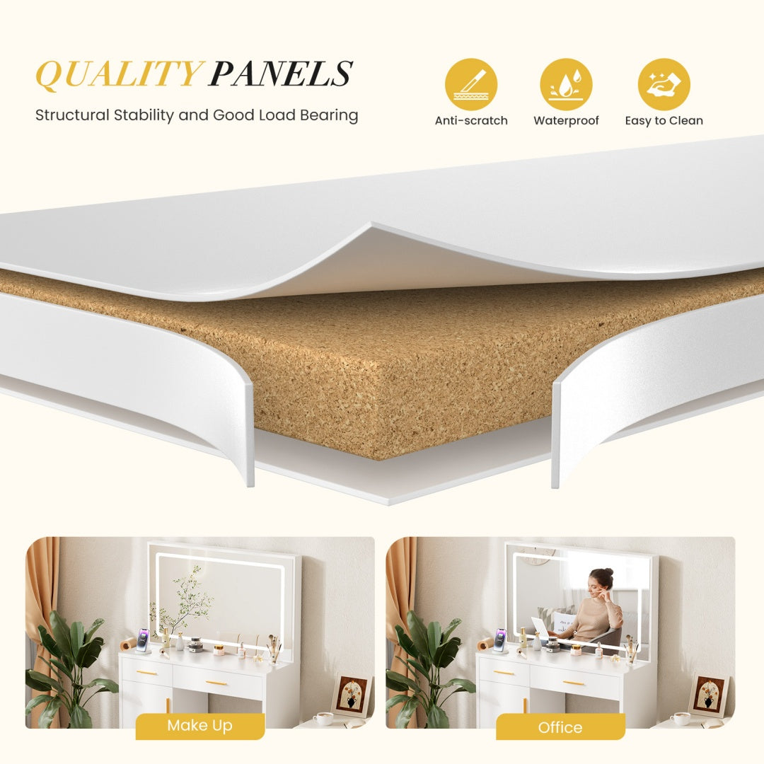 ??Sturdy And Built To Last??Made with high-quality MDF, this vanity desk is strong and stable. Everythings well-made and clearly labeled?aso assembly is quick and easy.