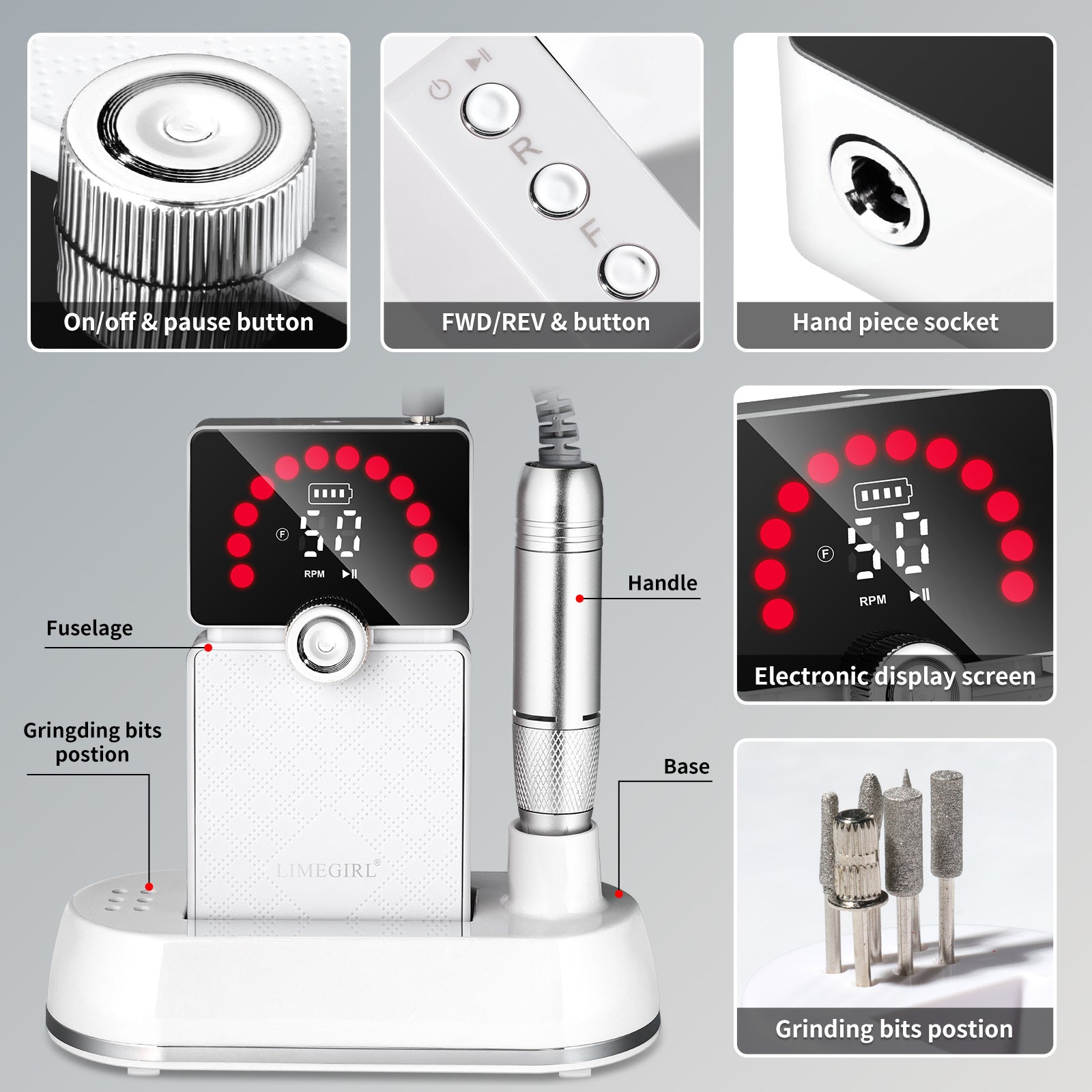 - Large LED Screen&Light Show: The nail drill kit features an intelligent LED display that creates a dynamic light show and changes as you adjust settings like speed or mode. This sleek, modern design not only enhances functionality but also provides a visually engaging experience. The soft lighting adds a touch of elegance, making every manicure session feel high-tech and enjoyable. The nail file combines visual appeal and ease of use in one device