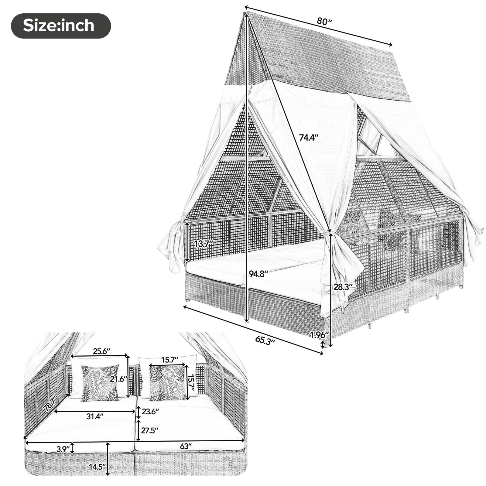 US Local Outdoor Daybed With Adjustable Backrest And Curtains, Double Sun Lounger