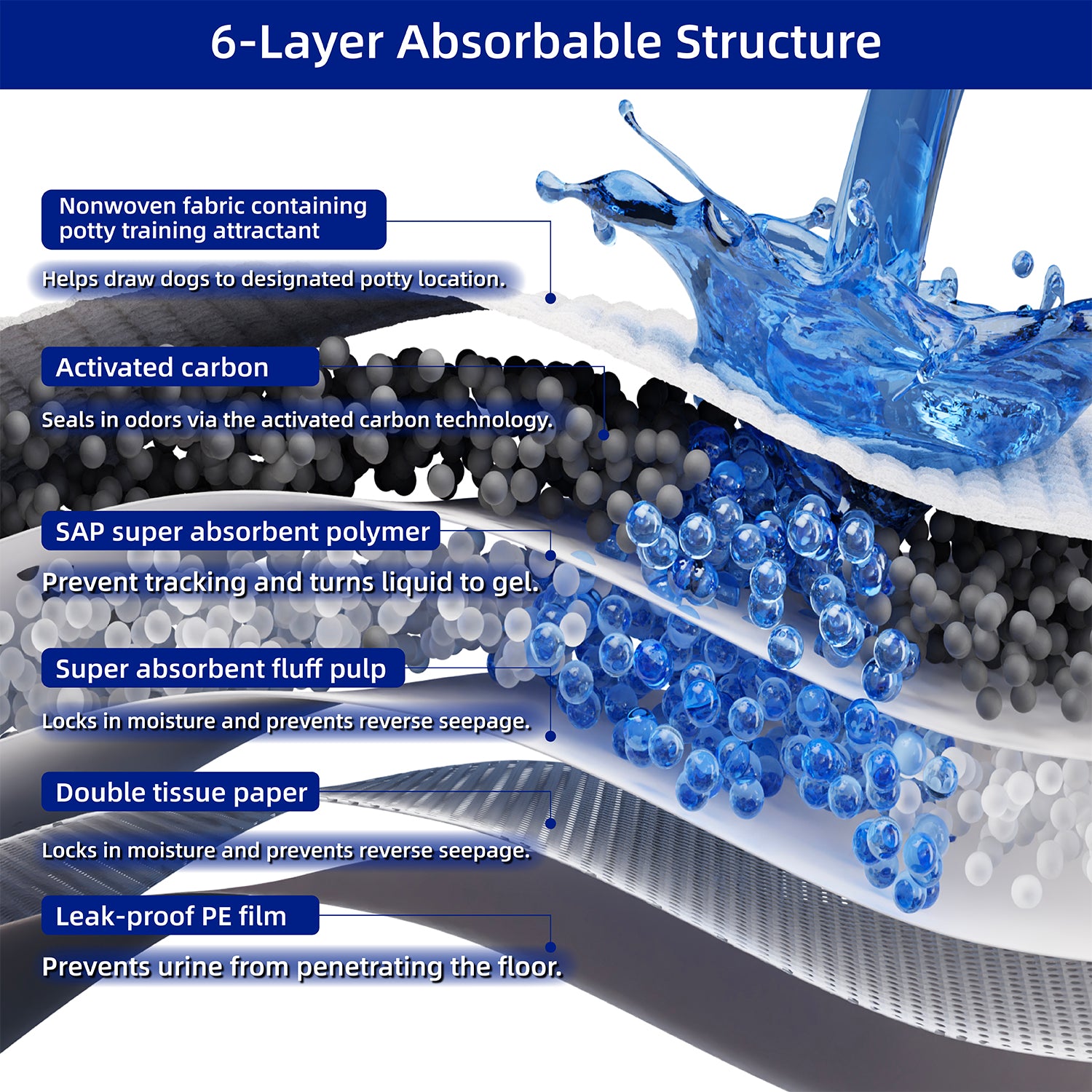 The pee pad contains bamboo charcoal components, which effectively absorb odors, provide strong water absorption and locking capabilities, and ensure dryness and leak prevention. It features a PE leak-proof bottom film and uses imported wood pulp from the United States, ensuring durability. Each box contains 50 sheets, addressing short-term needs for pets.