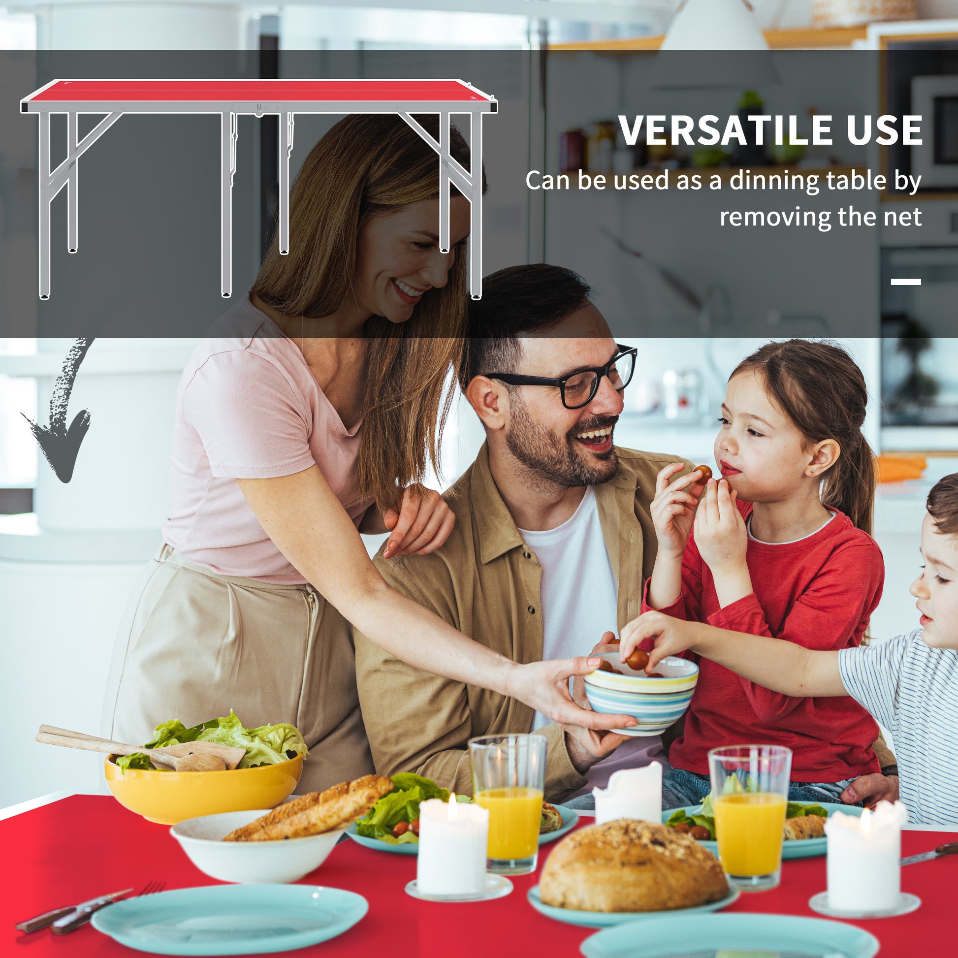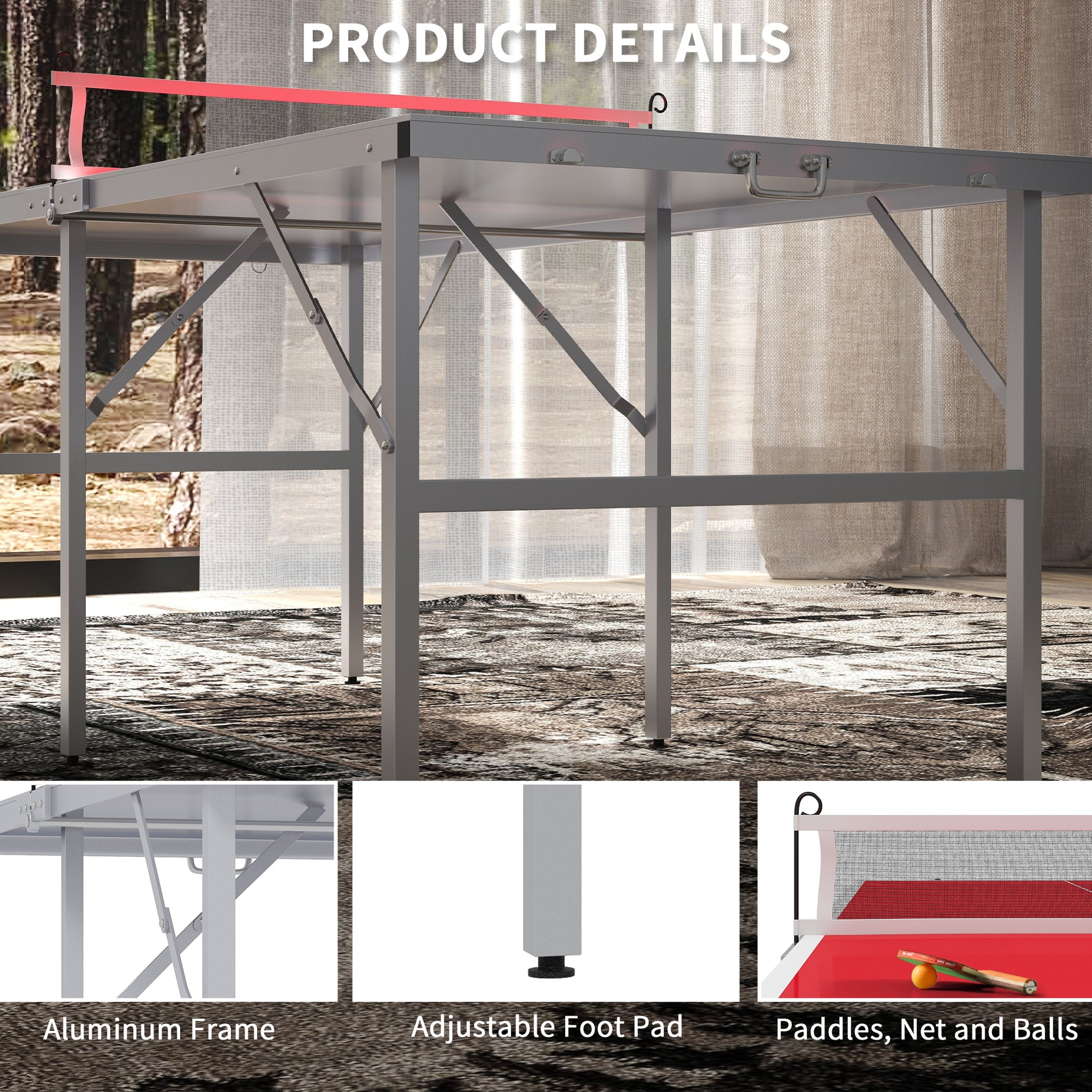 Indoor or outdoor you get more with our portable ping pong table. Play a game with friends; this ping pong table comes with 3 ping pong balls and 2 paddles, so you have everything you need to start. Our table is made of light yet strong aluminum, a water-safe material that allows you to use it outside. It's a foldable ping pong table, saving space and moving quickly via handles. It adapts, becoming a card table, a dining table, or a surface for any other social activity. Score big with Soozier. Features: - Foldable design with a handle and 2 latches for convenient transport and storage - Aluminum frame to resist water - Adjustable foot pads for a level top and to prevent scratches - Includes a net, two paddles and three balls - Can be used as an outdoor dining table by removing the net - Great for gardens, game rooms, gyms, and offices - Easy to set up with no tools Specification: - Color: Red - Material: Aluminum - Overall Dimensions: 70.75" L x 35.5" W x 30" H - Folded Dimensions: 35.5" L x 35.5" W x 3" D - Weight Capacity: 44 lbs. - Net Weight: 40 lbs. - Item Label: A90-350V00RD Package Includes: - 1 x Ping Pong Table - 2 x Paddle - 3 x Ball - 1 x Net - 1 x Manual Unfold the fun with the Soozier portable ping pong table set, ingeniously designed to fold into quarters for ultra-compact storage. With adjustable foot pads for a level playing field, this table tennis table supports up to 110 lbs. Remove the net, and voil¡§¡è?aa stylish dining or game table for all your entertainment needs. Features: - Folds into four for a smaller storage footprint than bi-folds - Adjustable foot pads accommodate uneven surfaces - Converts to a regular table without net - Removable net for versatile dining or gaming table use - Compact design designed for small spaces and easy transport - Steel construction for reliable use during various activities - Easy assembly required Specification: - Color: Charcoal Gray - Materials: MDF, Steel - Overall Dimensions: 107.9" L x 60" W x 29.9" H - Folded Dimensions: 53.9" L x 30" W x 3.9" D - Net Height: 6.3" H - Weight Capacity: 110 lbs. - Item Label: A90-352V80CG - Note: Table top is not waterproof, do not leave it outside in rain Package Includes: - 1 x Ping Pong Table - 2 x Paddle - 3 x Ping Pong Ball - 1 x Net - 1 x Manual.