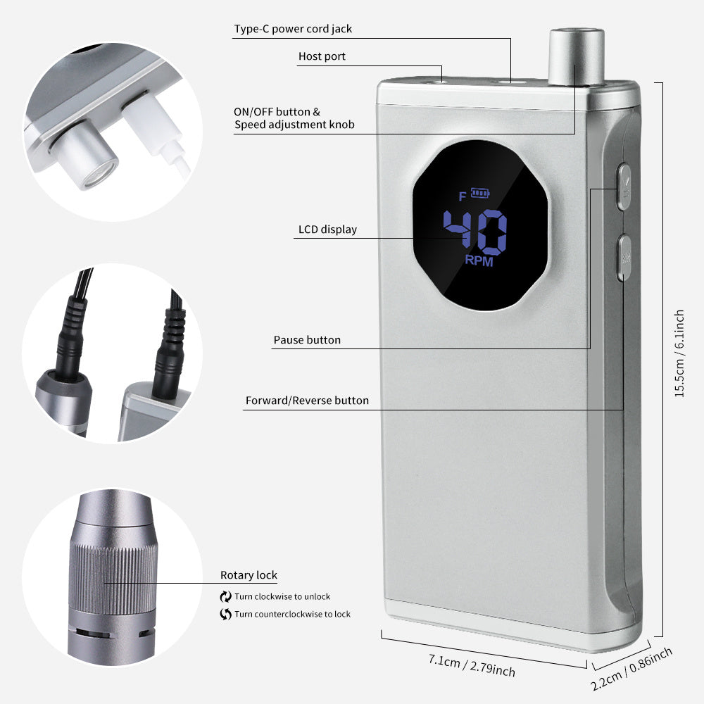 - ¡¾Long-lasting Battery Life¡¿The portable nail drill is equipped with a large-capacity battery that can be used continuously for 8-10 hours after charging for 3 hours, ensuring that you can use it outdoors or in places without power outlets. The intelligent LCD display clearly shows the rotation direction, speed and remaining power, allowing you to adjust the speed and charge in time.