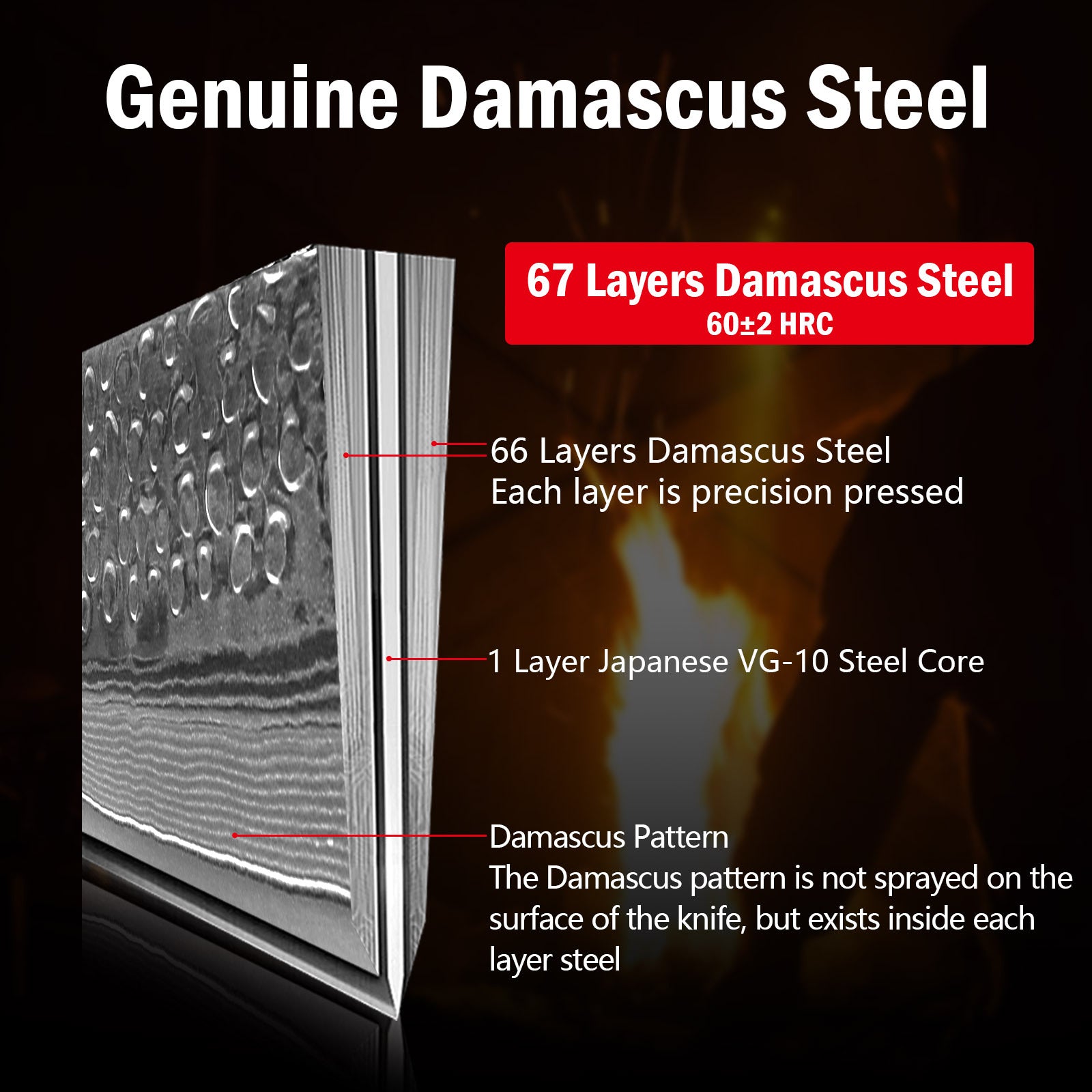 - ??ULTRA SHARP BLADE:This professional chef's knife is made from 67 layers of Damascus steel with a VG-10 steel core. The blade has been processed by vacuum high temperature and cryogenic processes, and the blade edge has excellent edge retention and is rust-resistant and corrosion-resistant. 66-layer high-carbon stainless steel Damascus steel cladding adds to the aesthetic appeal. HRC 60¡À2, the edges are not easy to chip or crack.