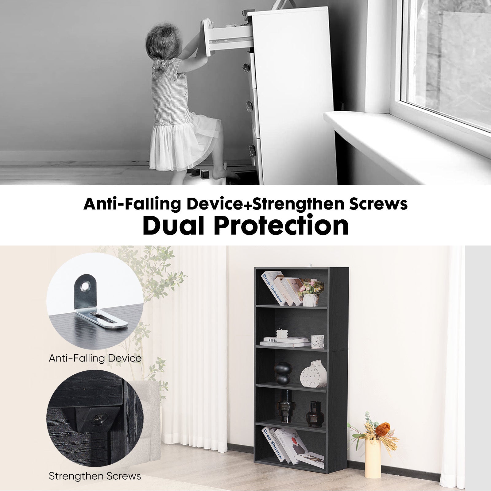 - ¡¾Anti-Tip Feature¡¿Enhancing the bookcase's stability is a topmost iron bracket designed to counter tipping. The installation process is straightforward - drill a hole in the wall, affix the bookcase and enjoy a steadfast storage solution!