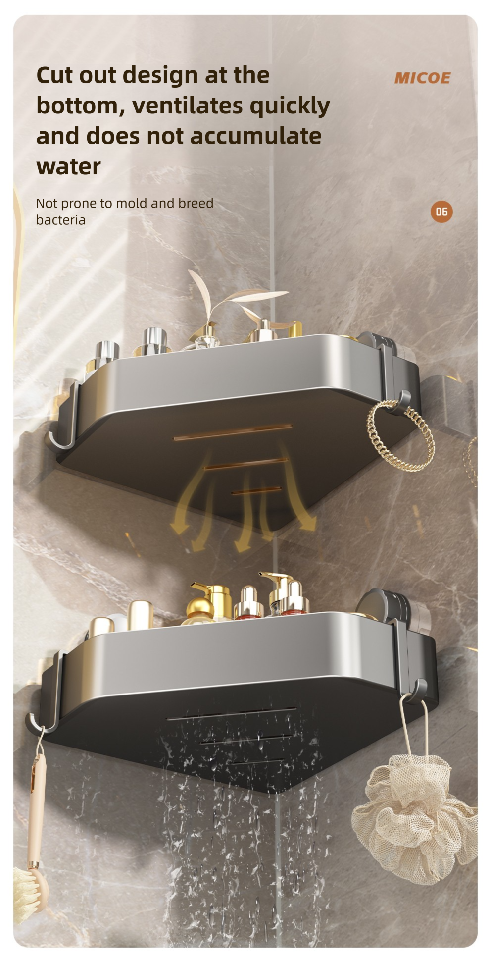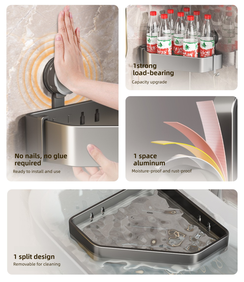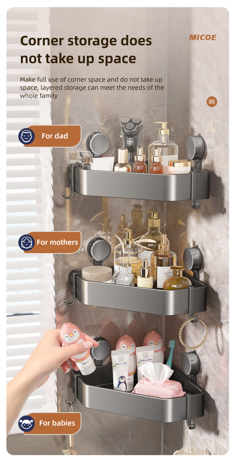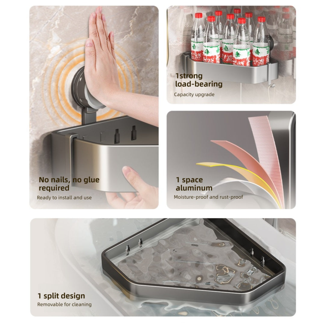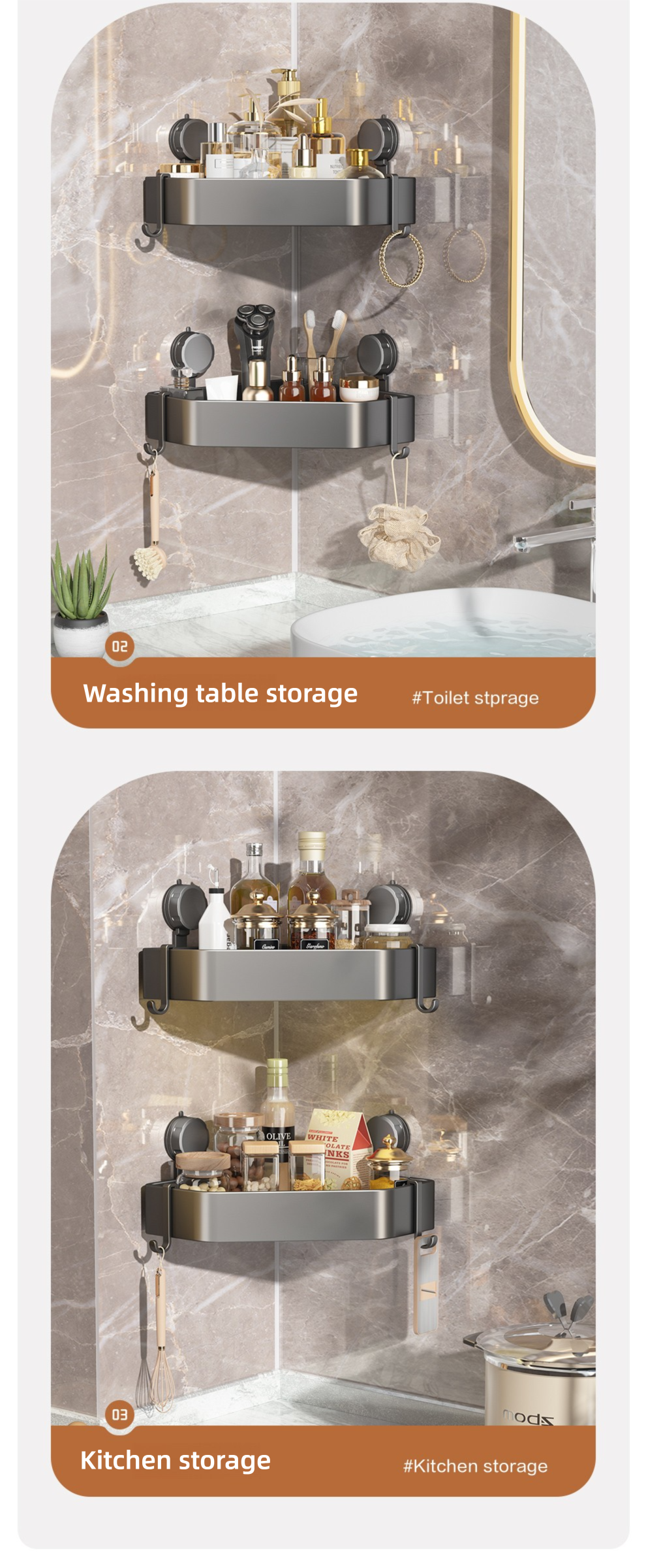 Corner shower rack - no need to drill holes, rust proof aluminum alloy, saving space. Strong suction cup diamond design bathroom shelf storage box (2-piece set - gun metal gray) (1-piece set with hook)