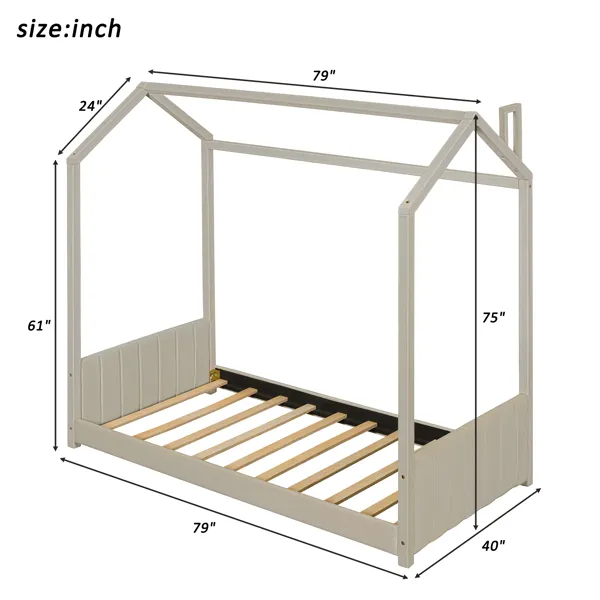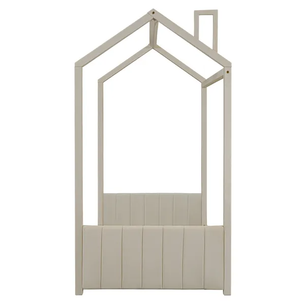 US Local Twin Size Velvet House Bed Wood Bed, Beige