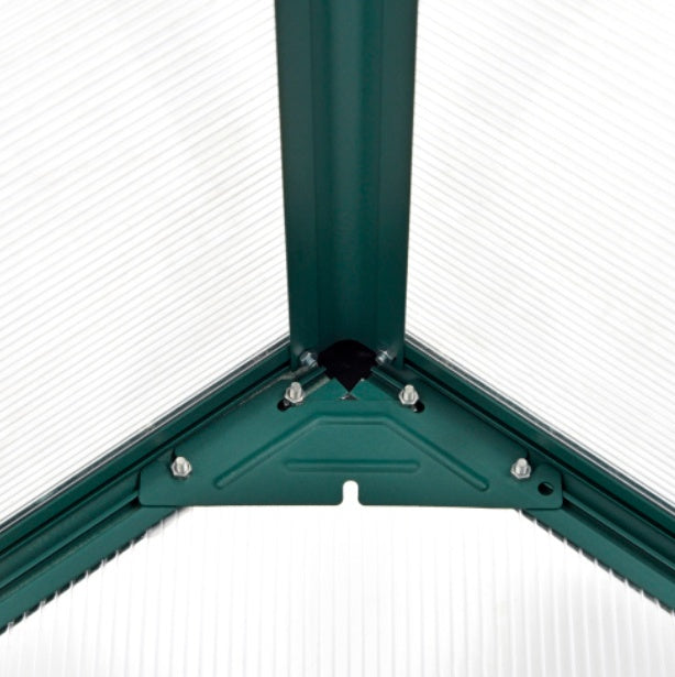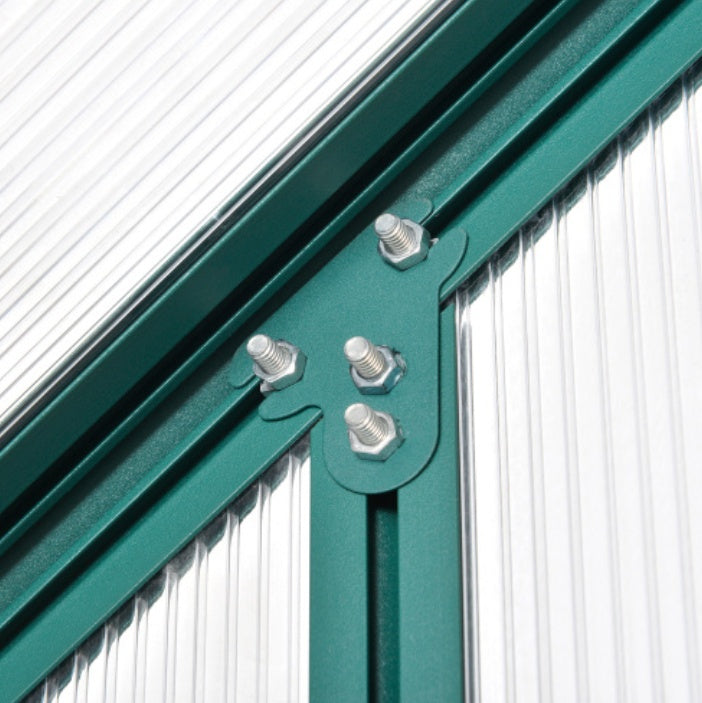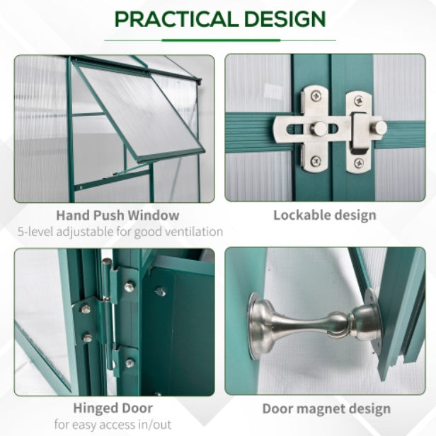 - ALUMINIUM FRAME: Naturally lightweight yet robust and resistant to rusting, it keeps the green house for garden structure in shape. POLYCARBONATE PANELS: Tough outside greenhouse panels which keep the heat in and allow sunshine to pass through the hobby greenhouse. 30um resistance to protect your crops from harsh UV.