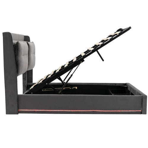 UK Local Upholstered Bed, 150x200 5ft King Size Bed, Hydraulic Bed, 2-in-1 Storage Drawers At The End Of The Bed, Recessed LED Light Strips On Both Sides Of The Bed, Slatted Frame, Velvet,Dark Gray