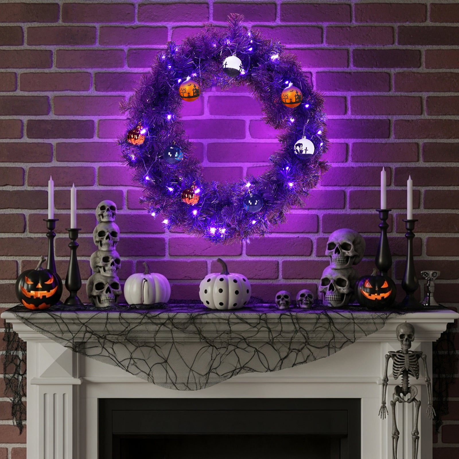 Add a festive twist to your seasonal decor with this 24-inch Halloween-themed Christmas wreath. Featuring a vibrant purple base and 50 glowing LED lights in eerie purple and orange tones, this pre-lit wreath brings a unique, spooky charm to your home. With 100 lifelike PVC branch tips and included DIY ball ornaments, it's perfect for crafting a one-of-a-kind holiday display with the whole family. The cordless, battery-powered design makes it easy to hang anywhere—from front doors and gates to interior walls and windows—without the hassle of outlets or tangled cords. Built from durable, flame-retardant materials, this wreath is made to light up your celebrations for years to come.