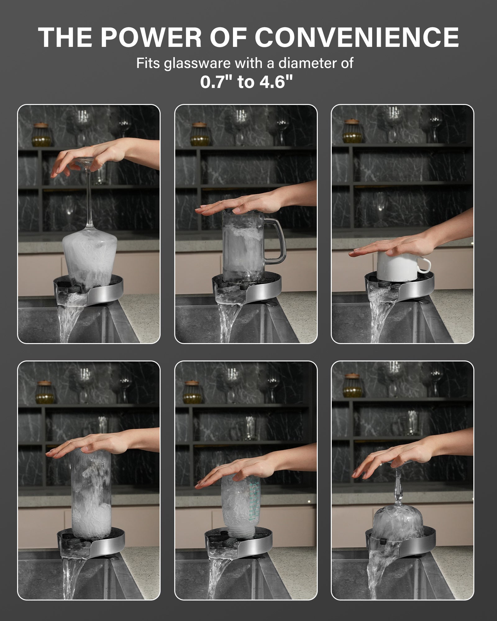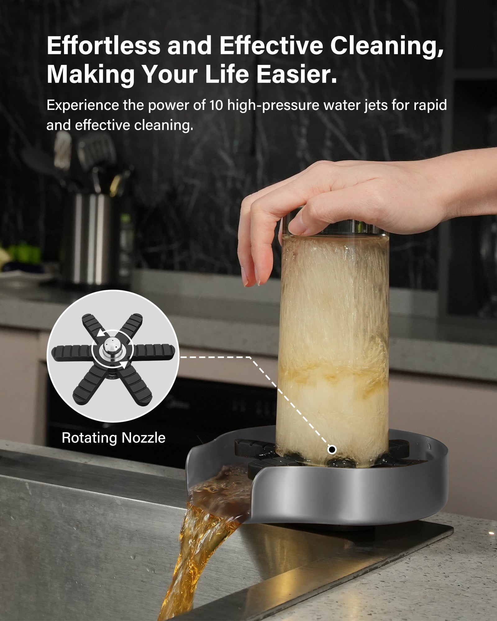 - [Quick Cleaning] Experience fast and efficient rinsing with our advanced glass rinser featuring a ¡°360¡ã StormJet¡± rotating nozzles, quickly blasting away coffee grounds, milk residue, and juice stains in 5 seconds. Turn rinsing into a fun, kid-friendly experience