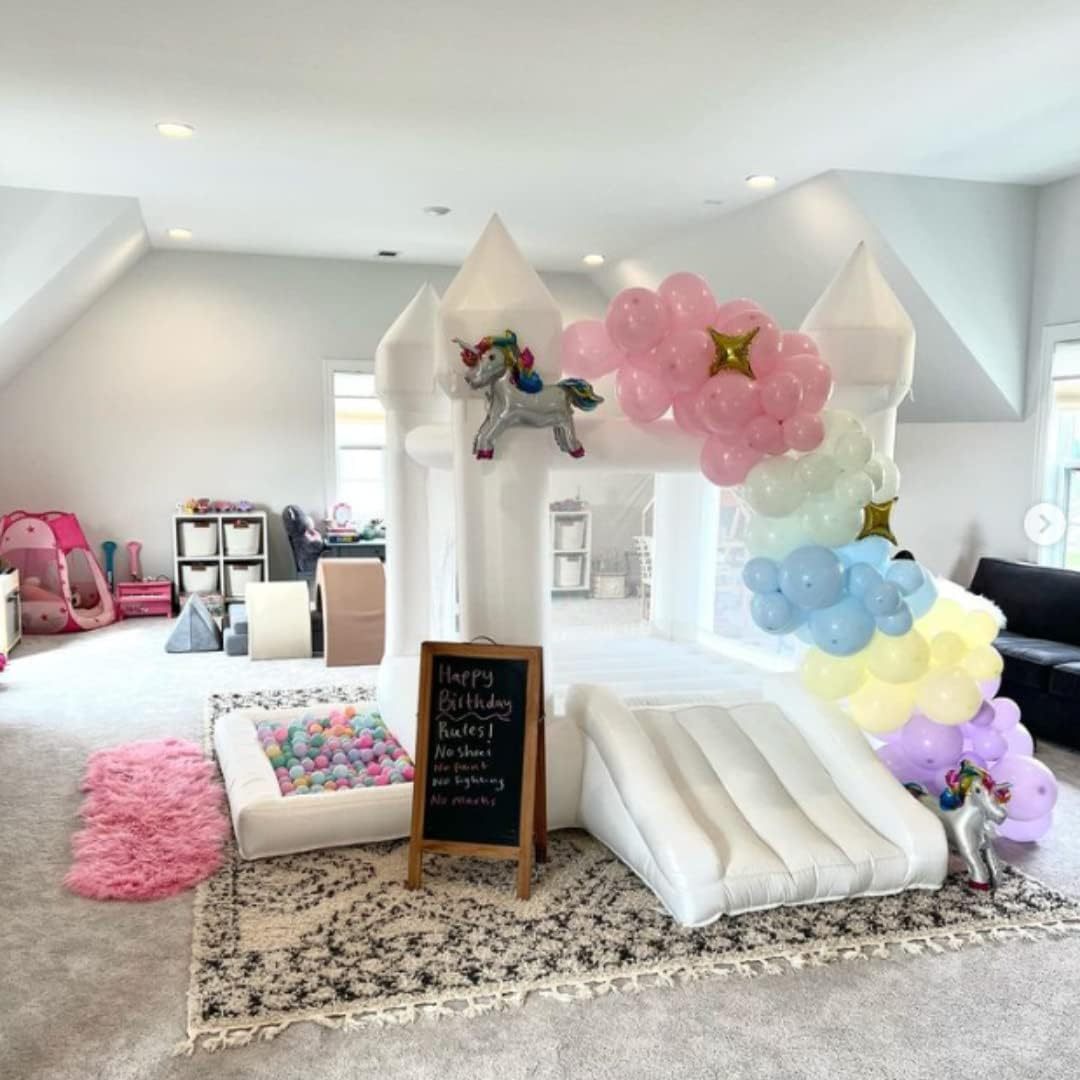 - 【Easy to set up】:The material of our white bounce house is thinner and durable, making the flexibility softer and comfortable. Easy to inflate and taking it down. About 90 seconds can inflat it, so that toddler to help burn off energy faster.