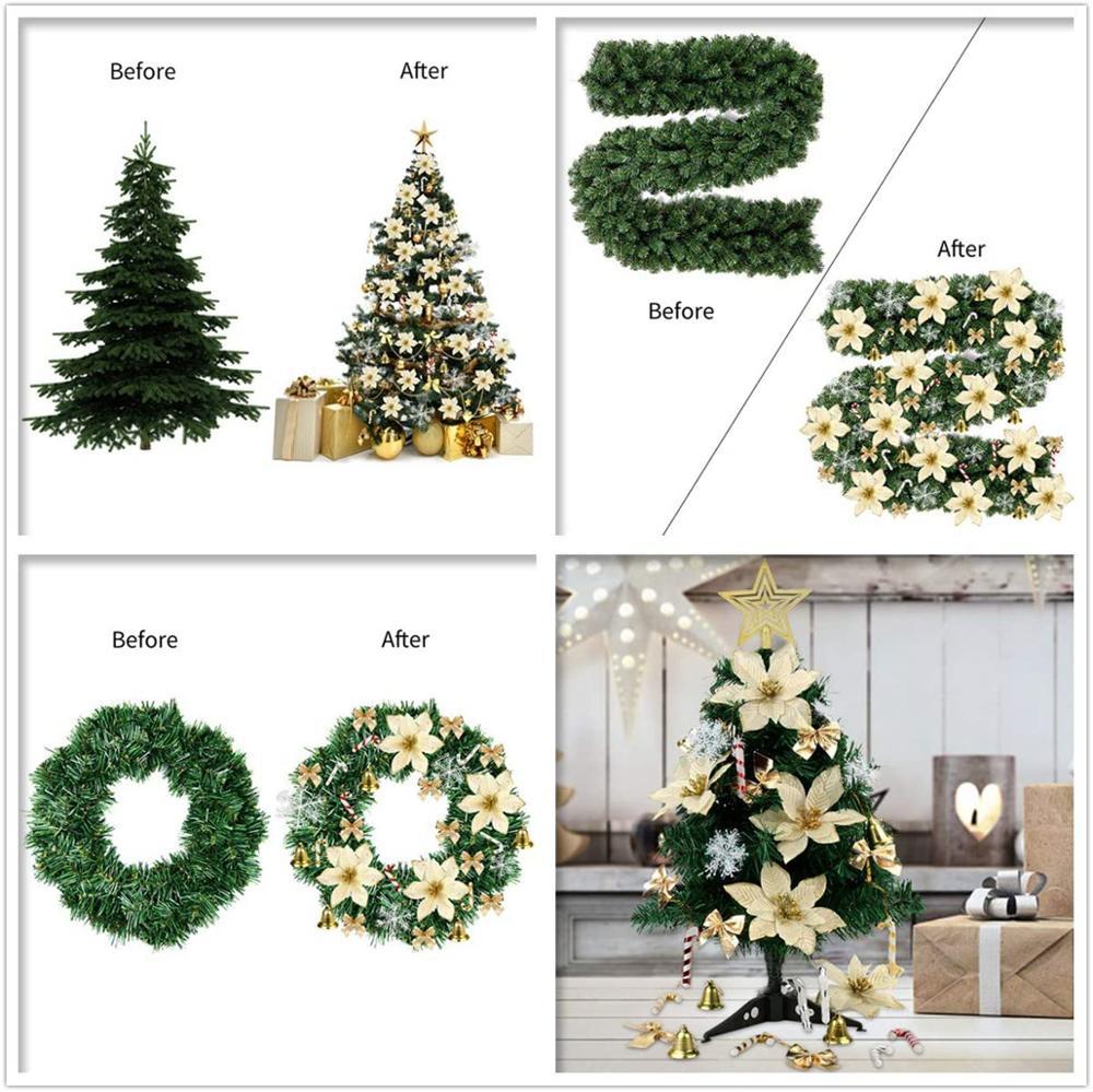 24 x Christmas tree flowers, 36x snowflakes, 12 x bows, 12 x bells, 12 x small canes, 24 x small clips