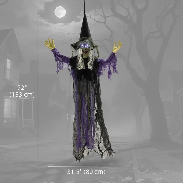 • Life-size realism: Hanging a lifelike 72" (183 cm) tall, this witch's glowing eyes and flowing robe add an eerie presence, making her a striking centerpiece for your Halloween scary decorations