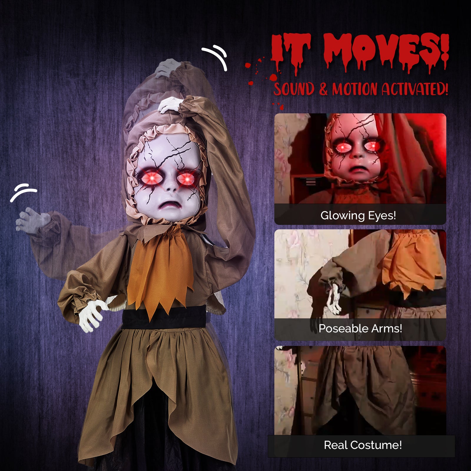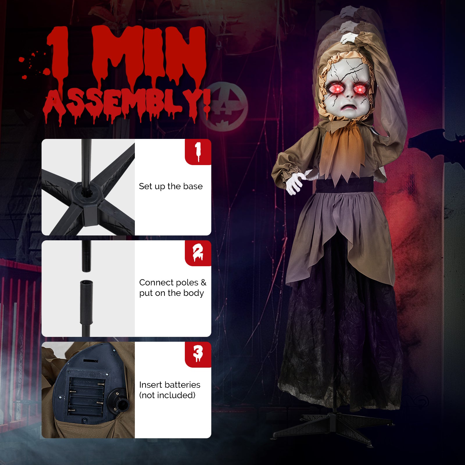 2. Quick and Easy Setup: Just a few minutes assemble and insert the pole to prop,and insert 3 AA batteries. Safe for both indoor and outdoor use, you can easily create a spooky scene wherever you choose.