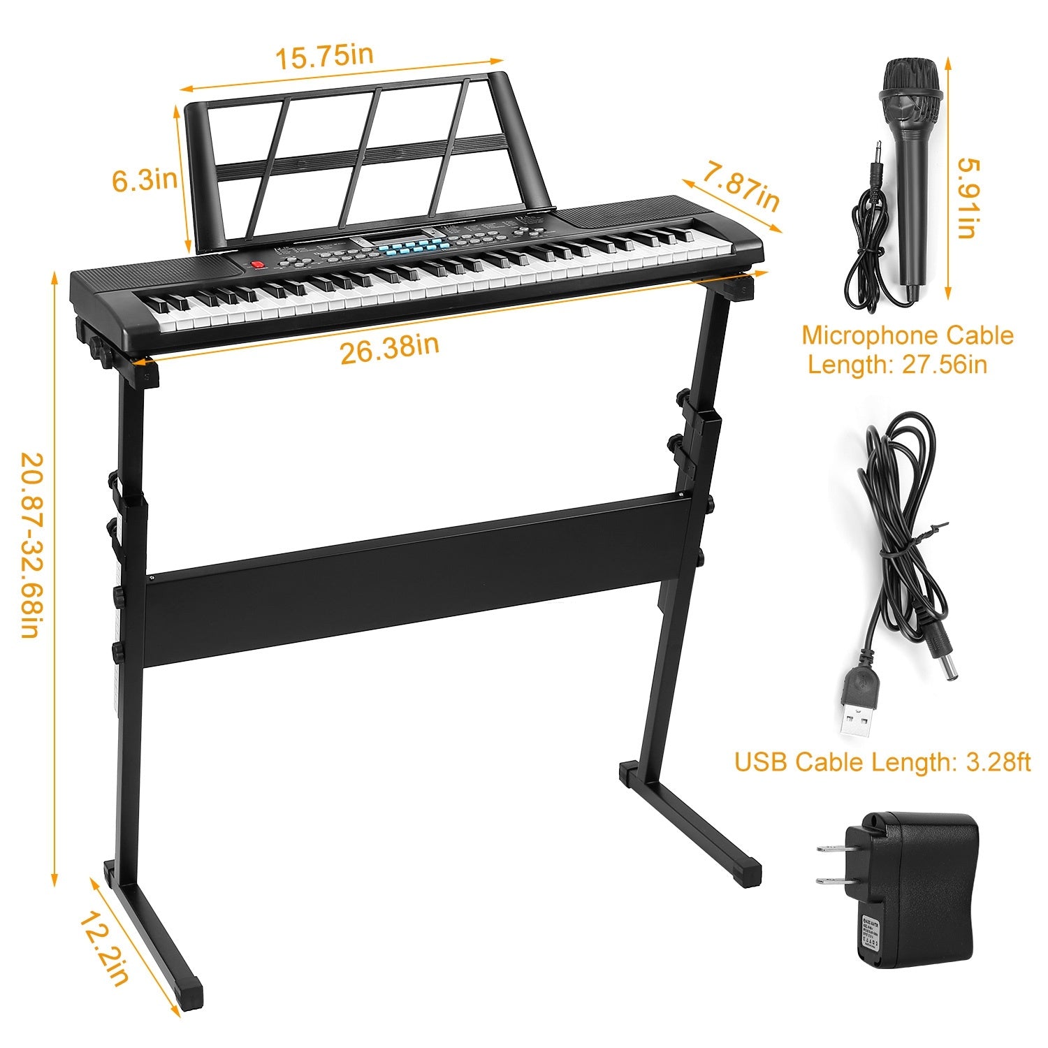 - *Height Adjustable Stand*: This music keyboard super kit package includes a keyboard stand that is sturdy in design and can be adjusted from 20.87in to 32.68in to suit keyboard piano players of different body height. It's also easy to install. No tools needed.