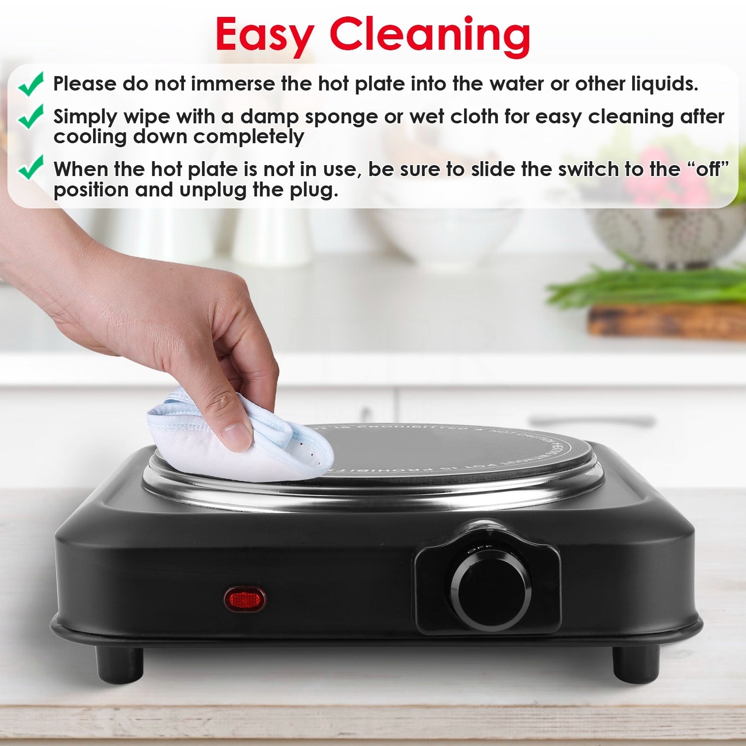 - *Thermostat Temp Control & Easy Cleaning*: The hot plate will auto shut off and the indicator light in front of the enclosure will be extinguished when the preset/desired temperature is reached. When it is lower than the temperature you set,the light turns red to indicate the cooktop is warming or heating. Just simply wipe the non-electrical parts with a damp sponge or half-wet cloth for easy cleaning after cooling down completely and plug removed.