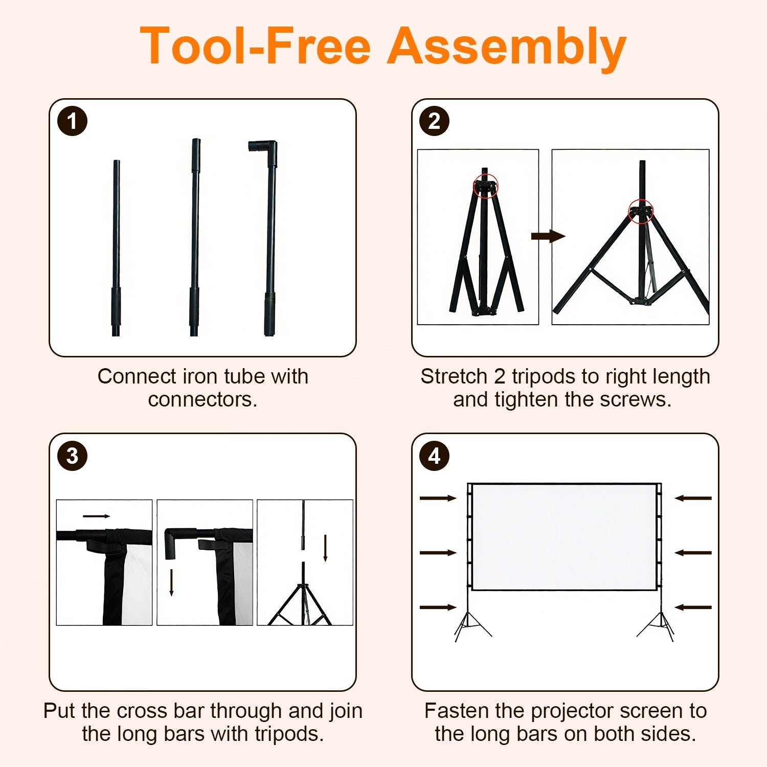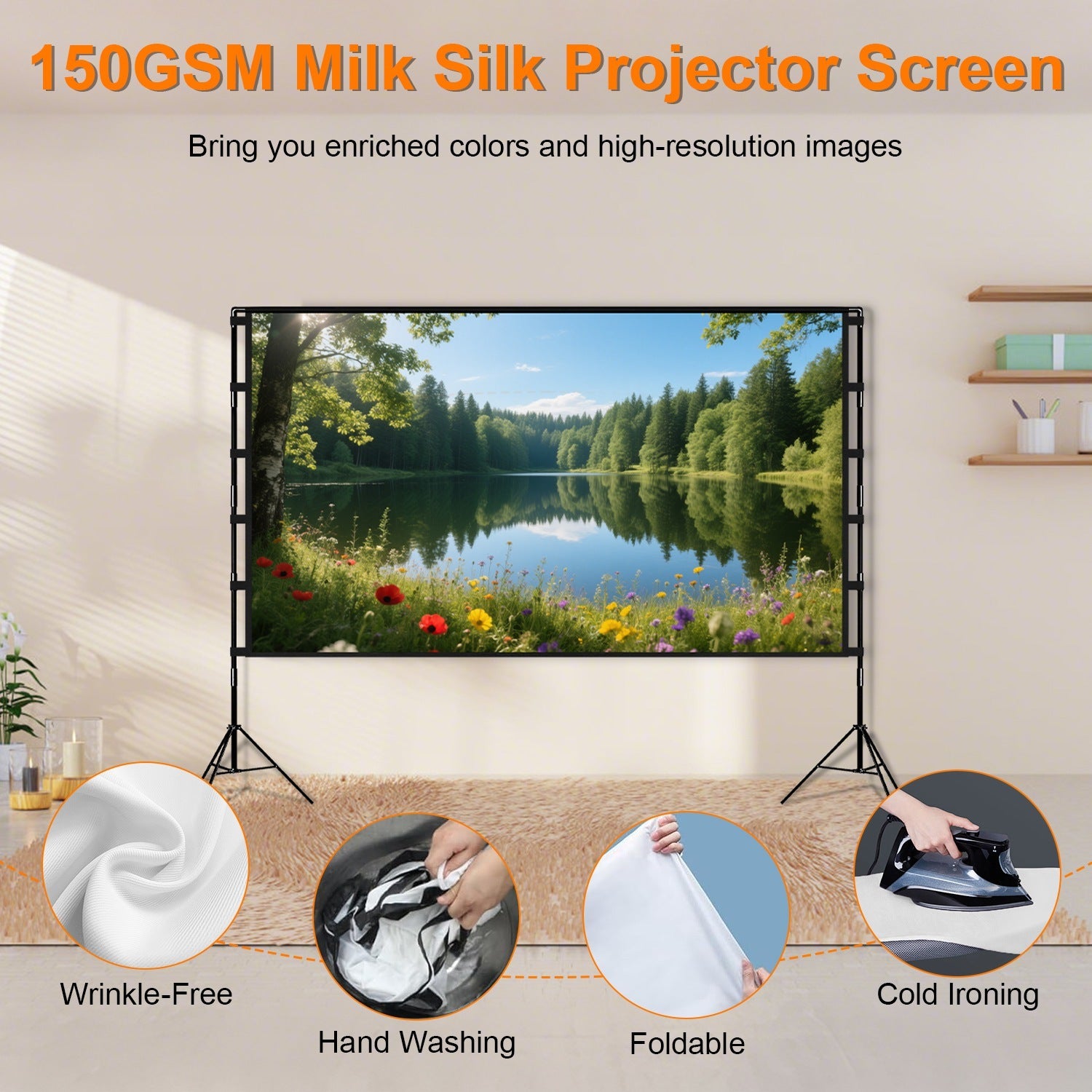 - * Wrinkle-Free Movie Screen *: ?Crafted from thickened 150GSM polyester milk silk,the foldable wrinkle-free movie screen remains flat and even,providing a flawless surface for 4K HD projection. Simple hand wash can effectively remove any dust or dirt,keeping the screen remain smooth and clean over time.
