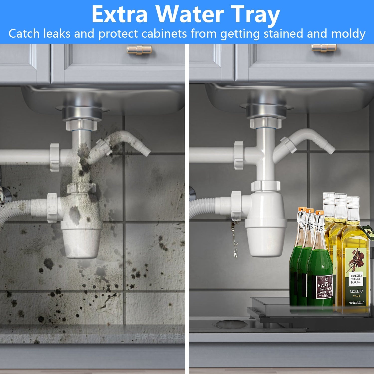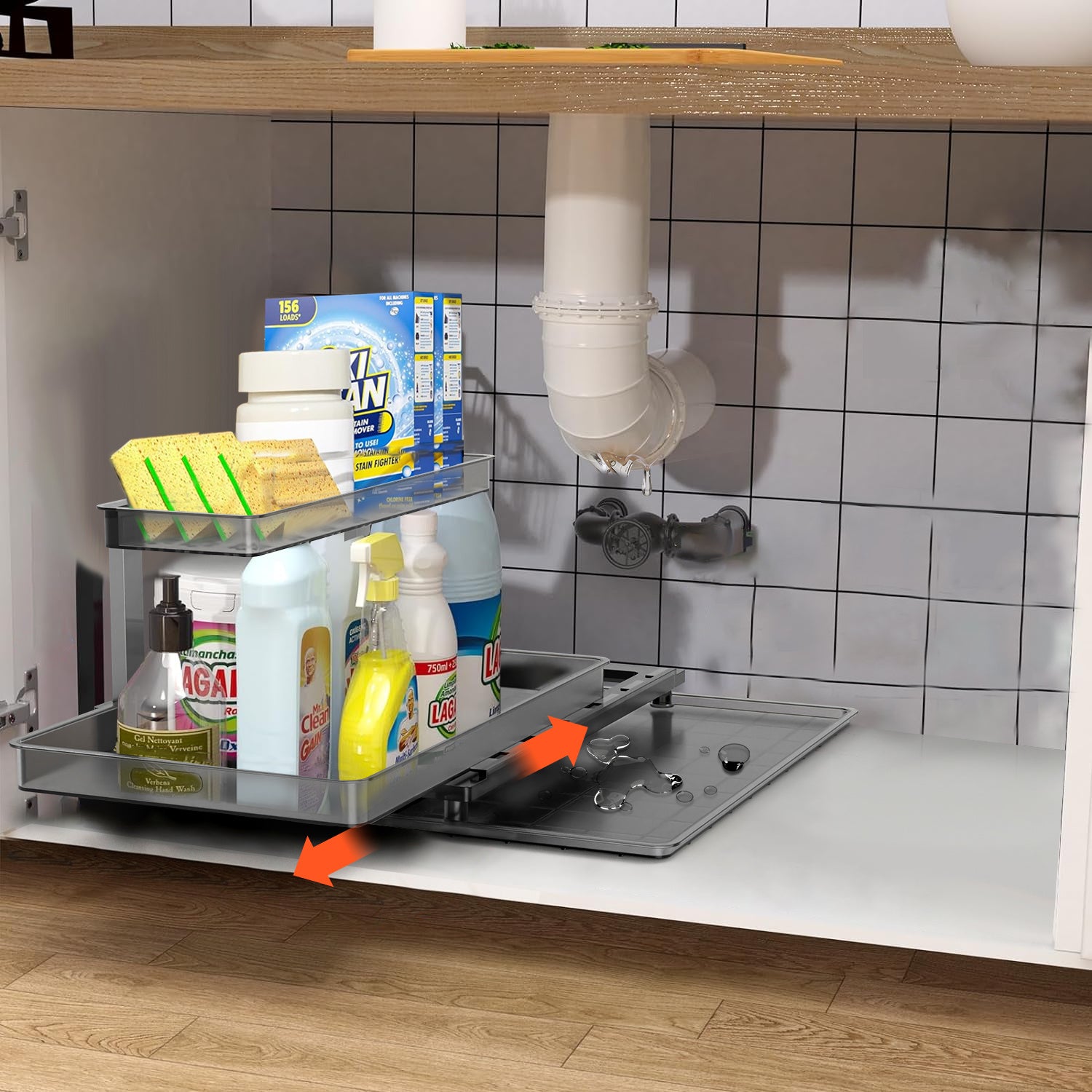 - *2-Tier Under Sink Organizer*: Our 2-tier under sink organizer is a versatile and practical solution for maximizing storage space in the often underutilized area beneath the kitchen or bathroom sink. Unique L-shaped design fits snugly around plumbing fixtures and allows for efficient use of vertical space,making it ideal for storing cleaning supplies,sponges,and other essential items.