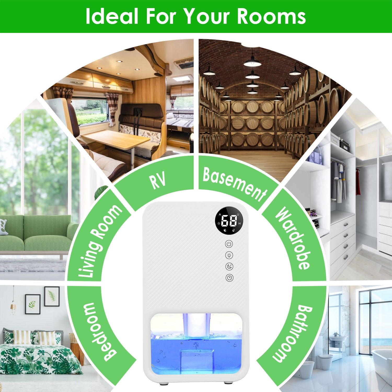 - *Highly Efficient Dehumidifier*: Built in real time humidity monitoring system,the dehumidifier will show the real time humidity in the display. Great to use the dehumidifier when the humidity is over 60%. It's able to remove up to 10oz of moisture per day(at 86¨H,80% RH), and cover an area up to 950sq.ft. Ideal for small spaces such as bathrooms, kitchens, cloakrooms, RV, etc..