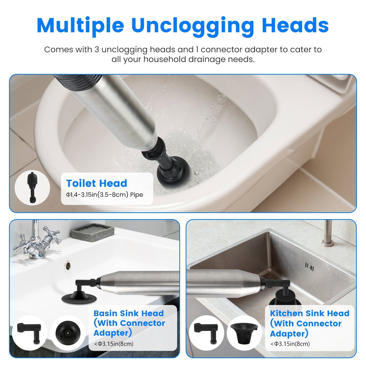 - *Multiple Heads & Versatile Usage*: This multi-functional air plunger comes with 1 x Toilet Head,1 x Basin Sink Head,1 x Kitchen Sink Head and 1 x Connector Adapter,able to tackle various unclogging problems,such as toilet,unclogging sinks,showers,kitchen drains,and pipelines. Great to cater to all your household drainage needs. We also provide you with 2 brushes and 6 gloves for daily assistance.