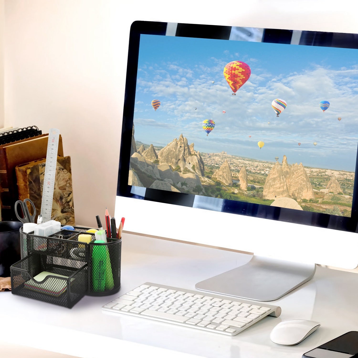 - ** 9 COMPARTMENTS *: Comes with 8 parts and 1 slide drawer,4 mesh hollow arc pencil side cups keep pens,rulers and scissors well organized,4 additional shallow compartments on top for gadgets storage such as clips,thumbtacks and clamps,and 1 individual small notched supply drawer pulls out to hold 4.9?¡Àx4.6?¡À sticky notes. A great organizer for keeping your desktop neat and tidy.