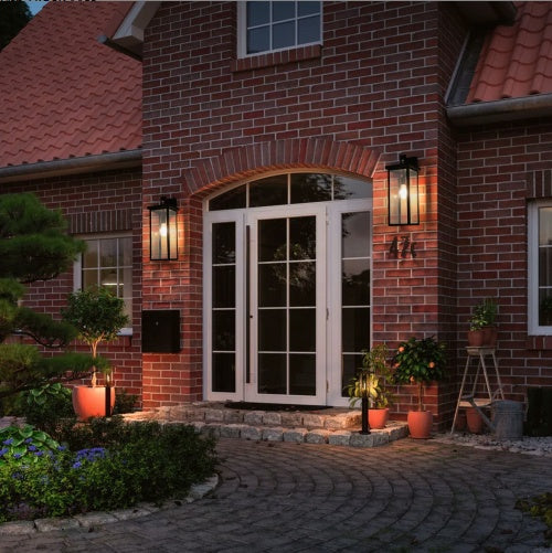 Product Name:20"(H) Set of 2 Modern Outdoor Wall Lanterns with Black Metal Frame and Clear Glass, Weatherproof Wall Sconces for Porch, Garage, or Entryway Lighting, E26 Bulb Compatible (No Bulbs)