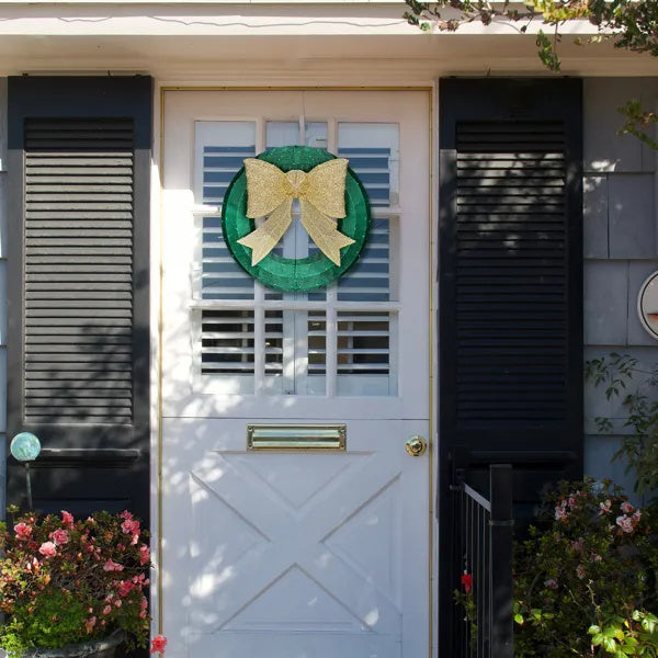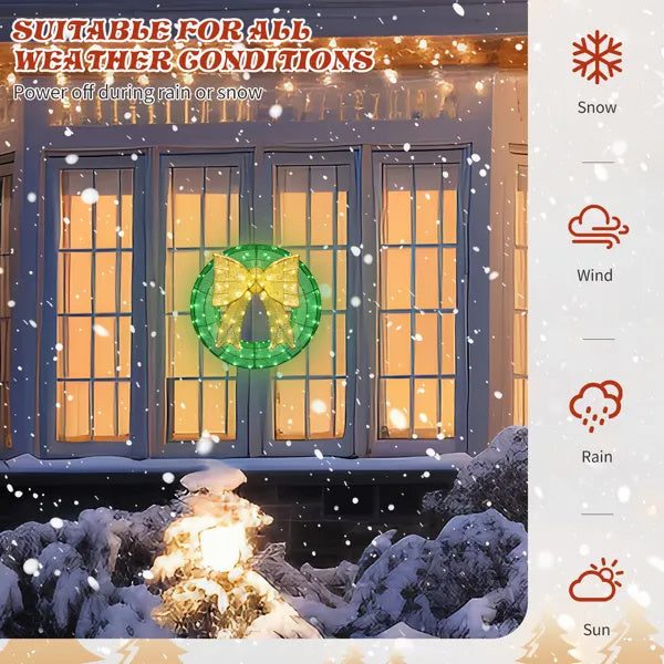 US Local 24in Pre-lit Outdoor Christmas Wreath Decoration, Lighted Metal Wreath With Golden Bow, Green And Warm White LED Lights, For Front Door Gate Wall Indoor Outdoor Holiday Party