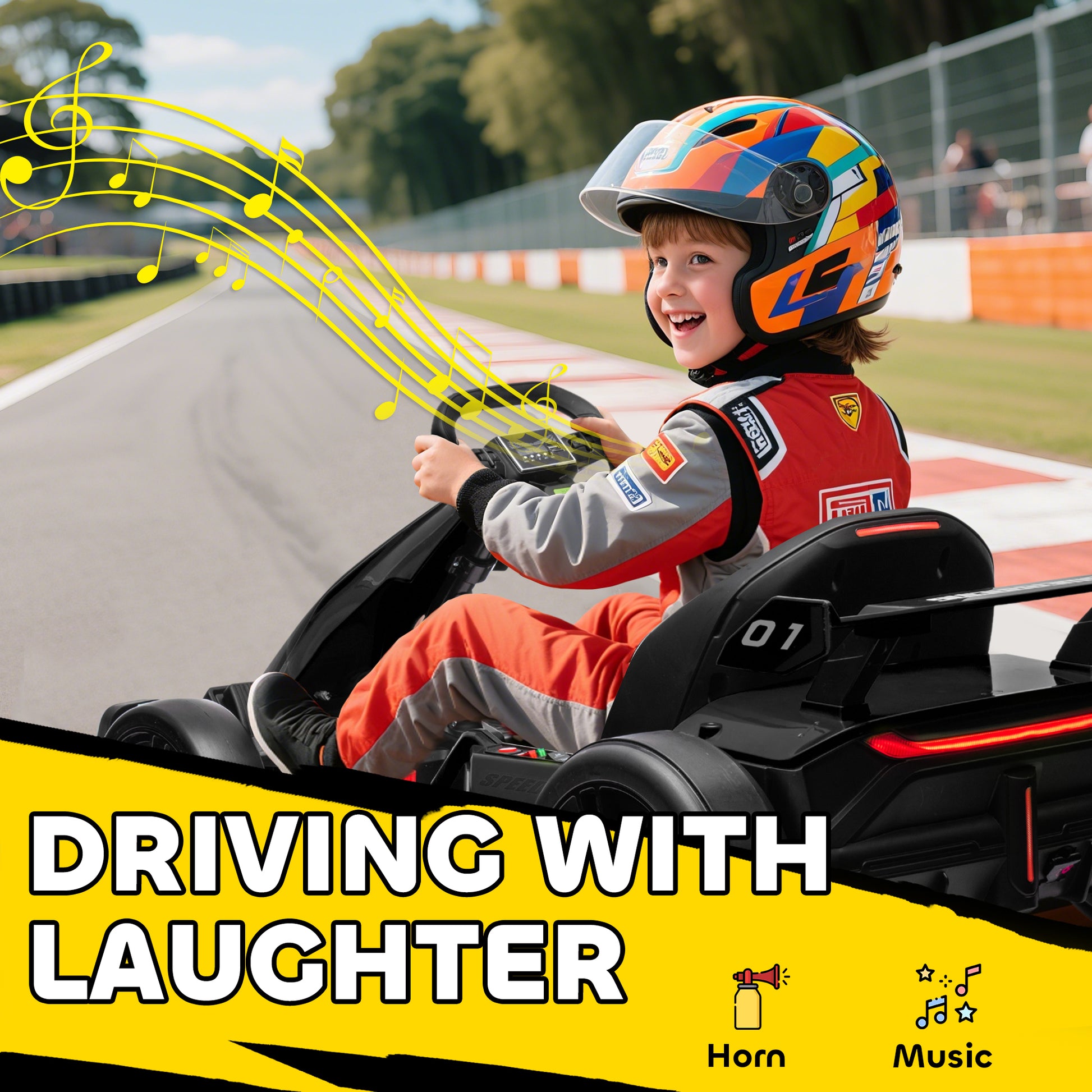 Ignite boundless outdoor excitement with our Aosom electric go-kart. Your young speedster will experience the thrill of a lifetime as they drift and race. Equipped with a powerful 24V dual-drive motor, they'll conquer speeds up to 7.5 mph, fostering a sense of adventure. Bring greater immersion with a realistic horn and music controls for realism in every ride. Elevate playtime with a superior ride-on experience, spark imagination, and raise the hype factor. Features: - Reach a maximum speed of 7.5 mph - Exciting drifting capabilities, adding adventure to every ride - Realistic horn and music function and power indicator - Adjustable seat with three levels and a range of 20.75" - 26.5" accommodates growing kids - Smooth soft-starting technology ensures comfortable and safe acceleration - Equipped with a high-strength steel frame and a polypropylene body - Wear-resistant wheels for improved traction on unforgiving terrain - Assembly required Specification: - Color: Red, Black - Materials: Polypropylene, Steel - Overall Dimensions: 47.25" L x 30" W x 21" H - Seat Dimensions: 15.75" W x 9.5" D x 6" H. Adjustment Range: 20.75" - 26.5" H - Battery: 24V, 5AH - First Charge Time: 6-8 hours. Regular: 8-12 hours - Run Time: 50 Min - Speed: 3.7-7.5 Mph - EVA Wheels: 8.25" Dia. Nylon Wheels: 10.75" Dia. - Weight Capacity: 110 lbs. - Qualification Ages: 6+ years old. Recommended Ages: 6-12 years old - Qualification: ASTM F963, CPSIA - Item Label: 370-287V80RD - Note 1. Slow start is only available in sport mode 2. Always monitor your children while they are riding Package Includes: - 1 x Electric Ride-on Kart - 1 x Manual Ignite boundless outdoor excitement with our Aosom electric go-kart. Features: - Reach a maximum speed of 7.5 mph - Exciting drifting capabilities, adding adventure to every ride - Realistic horn and music function and power indicator - Adjustable seat with three levels and a range of 20.75" - 26.5" accommodates growing kids - Smooth soft-starting technology ensures comfortable and safe acceleration - Equipped with a high-strength steel frame and a polypropylene body - Wear-resistant wheels for improved traction on unforgiving terrain - Assembly required Specification: - Color: Green, Black - Materials: Polypropylene, Steel - Overall Dimensions: 47.25" L x 30" W x 21" H - Seat Dimensions: 15.75" W x 9.5" D x 6" H. Recommended Ages: 6-12 years old - Qualification: ASTM F963, CPSIA - Item Label: 370-287V80GN - Note 1. Features: - Reach a maximum speed of 7.5 mph - Exciting drifting capabilities, adding adventure to every ride - Realistic horn and music function and power indicator - Adjustable seat with three levels and a range of 20.75" - 26.5" accommodates growing kids - Smooth soft-starting technology ensures comfortable and safe acceleration - Equipped with a high-strength steel frame and a polypropylene body - Wear-resistant wheels for improved traction on unforgiving terrain - Assembly required Specification: - Color: White, Black - Materials: Polypropylene, Steel - Overall Dimensions: 47.25" L x 30" W x 21" H - Seat Dimensions: 15.75" W x 9.5" D x 6" H. Recommended Ages: 6-12 years old - Qualification: ASTM F963, CPSIA - Item Label: 370-287V80WT - Note 1. Features: - Reach a maximum speed of 7.5 mph - Exciting drifting capabilities, adding adventure to every ride - Realistic horn and music function and power indicator - Adjustable seat with three levels and a range of 20.75" - 26.5" accommodates growing kids - Smooth soft-starting technology ensures comfortable and safe acceleration - Equipped with a high-strength steel frame and a polypropylene body - Wear-resistant wheels for improved traction on unforgiving terrain - Assembly required Specification: - Color: Black - Materials: Polypropylene, Steel - Overall Dimensions: 47.25" L x 30" W x 21" H - Seat Dimensions: 15.75" W x 9.5" D x 6" H. Recommended Ages: 6-12 years old - Qualification: ASTM F963, CPSIA - Item Label: 370-287V80BK - Note 1. Features: - Reach a maximum speed of 7.5 mph - Exciting drifting capabilities, adding adventure to every ride - Realistic horn and music function and power indicator - Adjustable seat with three levels and a range of 20.75" - 26.5" accommodates growing kids - Smooth soft-starting technology ensures comfortable and safe acceleration - Equipped with a high-strength steel frame and a polypropylene body - Wear-resistant wheels for improved traction on unforgiving terrain - Assembly required Specification: - Color: Pink, Black - Materials: Polypropylene, Steel - Overall Dimensions: 47.25" L x 30" W x 21" H - Seat Dimensions: 15.75" W x 9.5" D x 6" H. Recommended Ages: 6-12 years old - Qualification: ASTM F963, CPSIA - Item Label: 370-287V80PK - Note 1. Always monitor your children while they are riding Package Includes: - 1 x Electric Ride-on Kart - 1 x Manual.