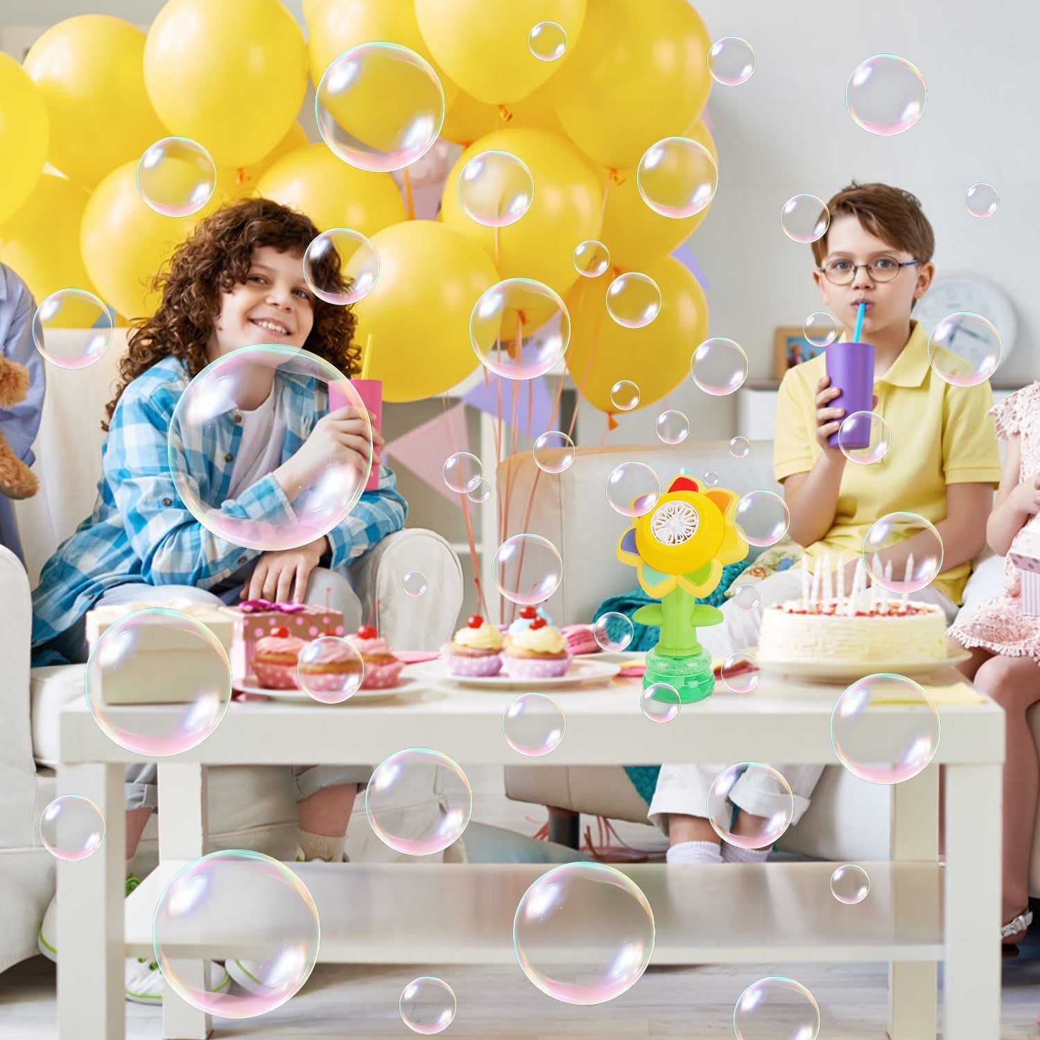 *Dancing Sunflower With Lights*:Featured with unique sunflower shape and vibrant LED lights,this flower bubble maker starts to swing its head and blow bubbles in different directions once turned on,adding fun and attraction for your kids.