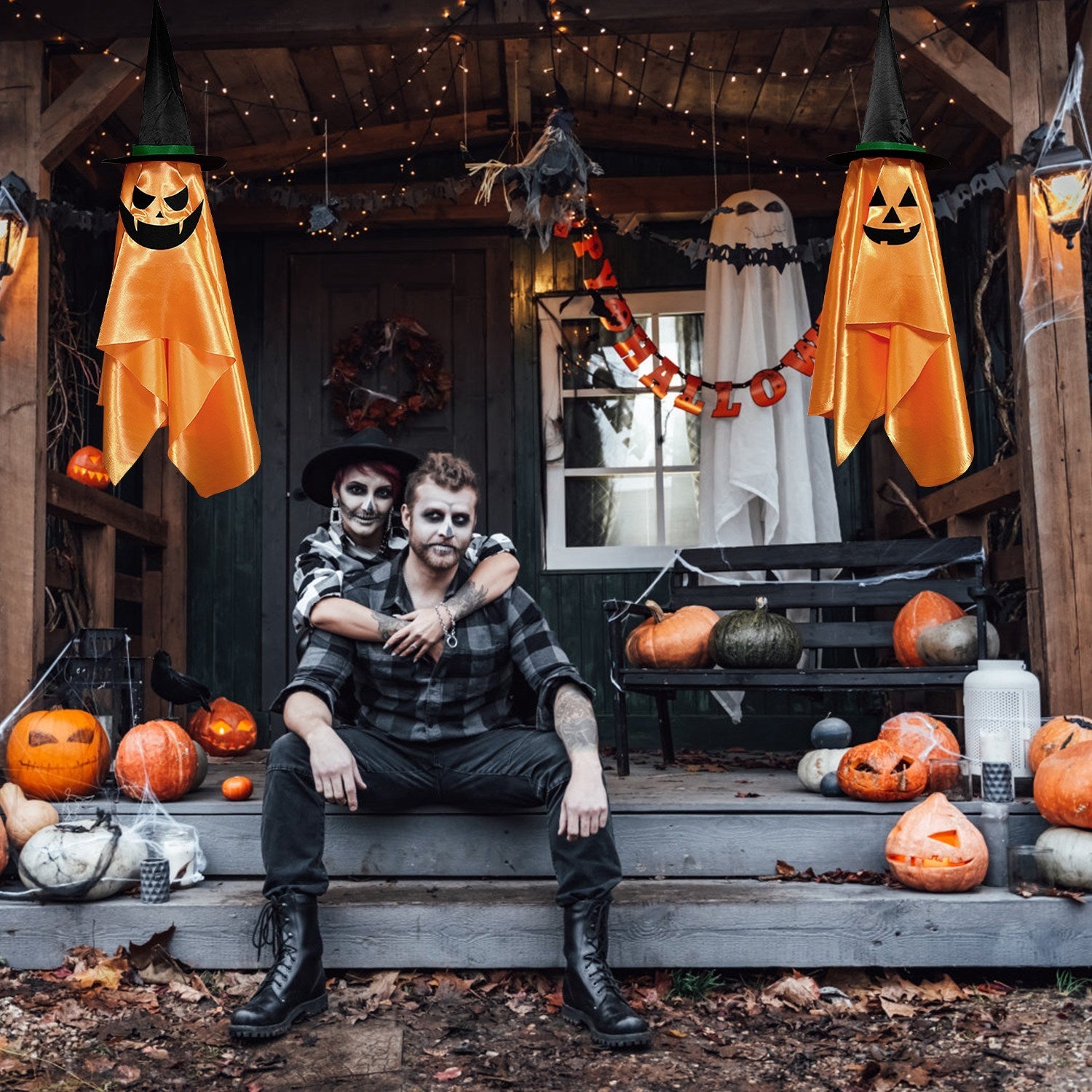 2Pcs Hanging Ghosts With Wizard Hat Snicker Scary Face Halloween Party Hanging Decorations Pumpkin Wizard Hat For Eave Tree Porch