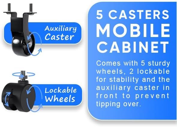 - [Easy Mobility] The mobile file cabinet comes with 5 casters,includes 4 lockable casters + 2x360?? swivel casters + 1xanti-tilt caster, allowing you to easily move it around your workspace and keep your important files at your hand
