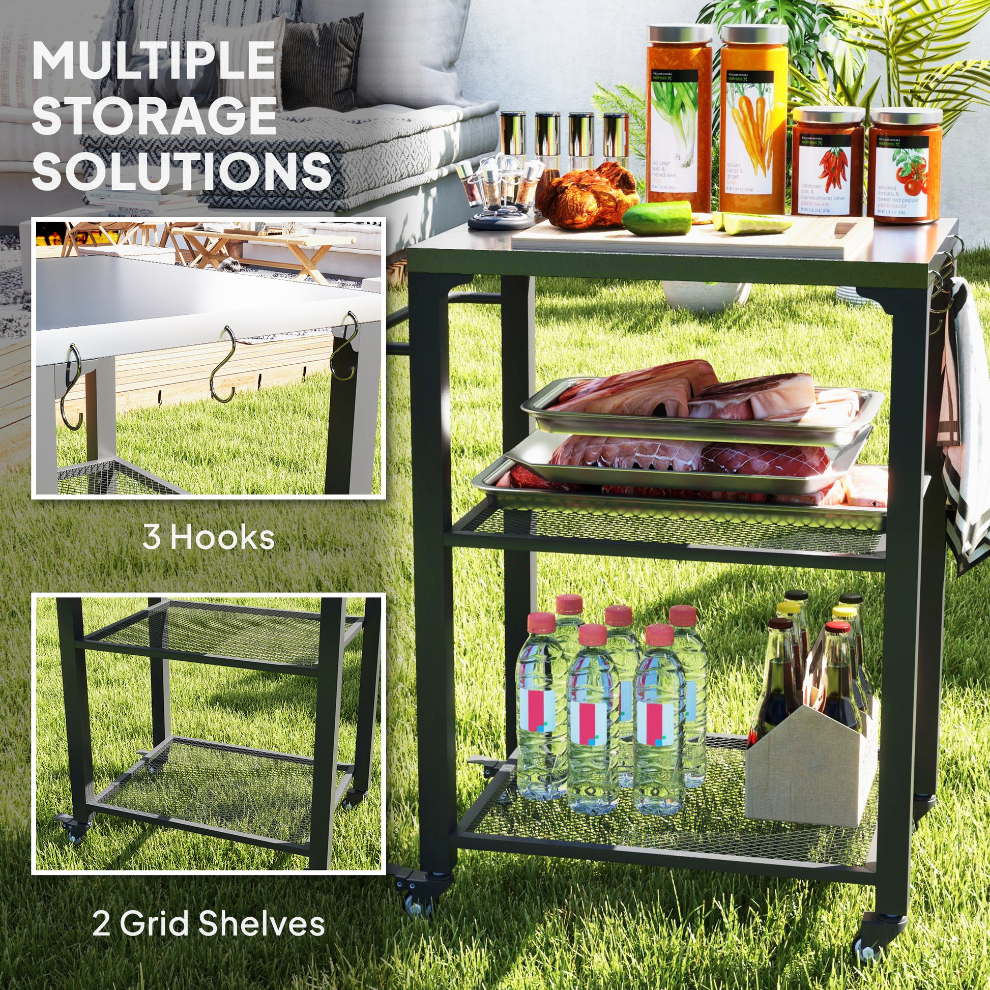 US Local 3-Shelf Outdoor Grill Cart With Stainless Steel Tabletop, Movable Pizza Oven Table With Hooks, Side Handle, Wheels