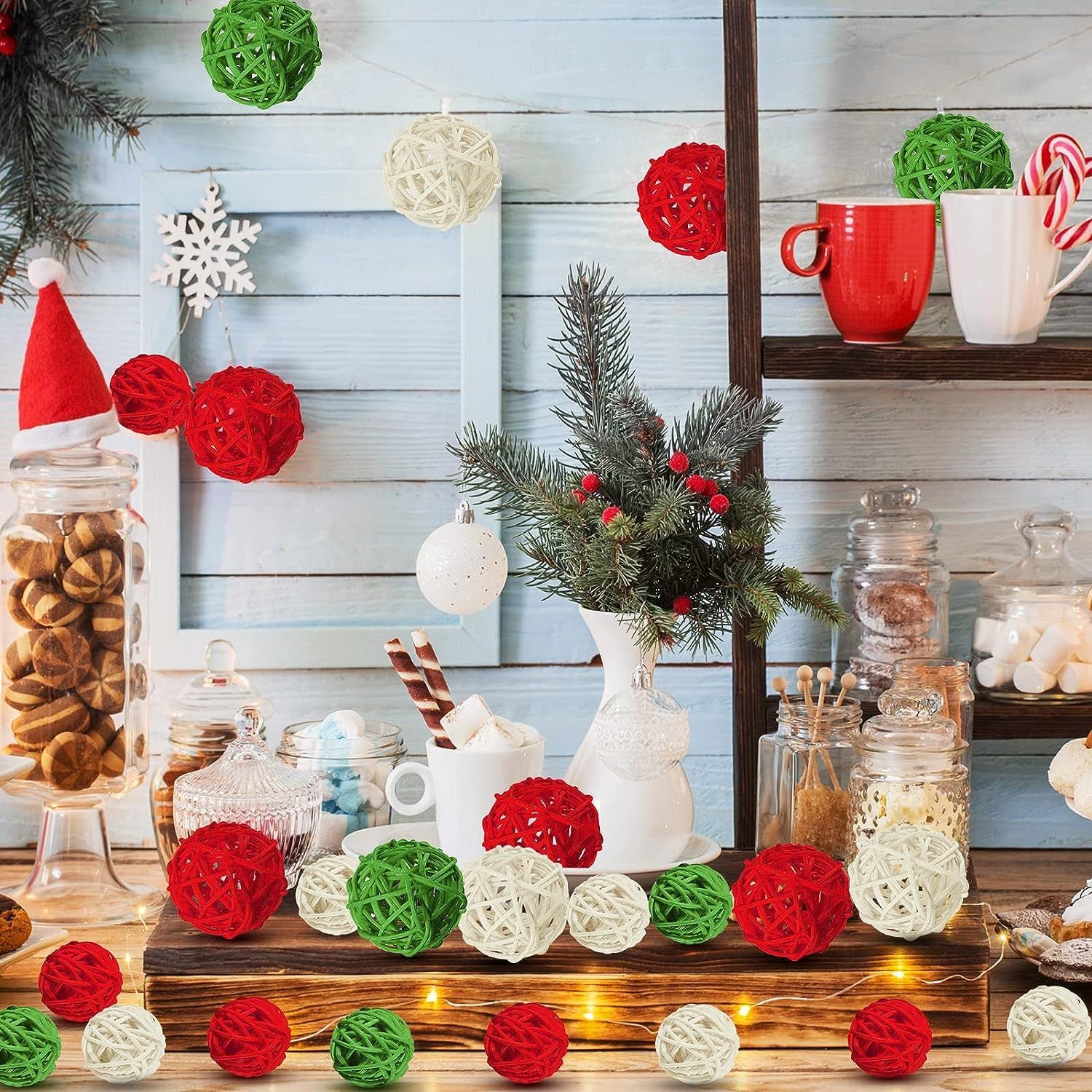 US Local 30 Pieces Wicker Rattan Balls Decorative Orbs For Bowl Centerpieces Christmas Vase Filler For Holiday Xmas Home Table Decor DIY Craft Aromatherapy Accessories, 1.2 Inch Red White Green